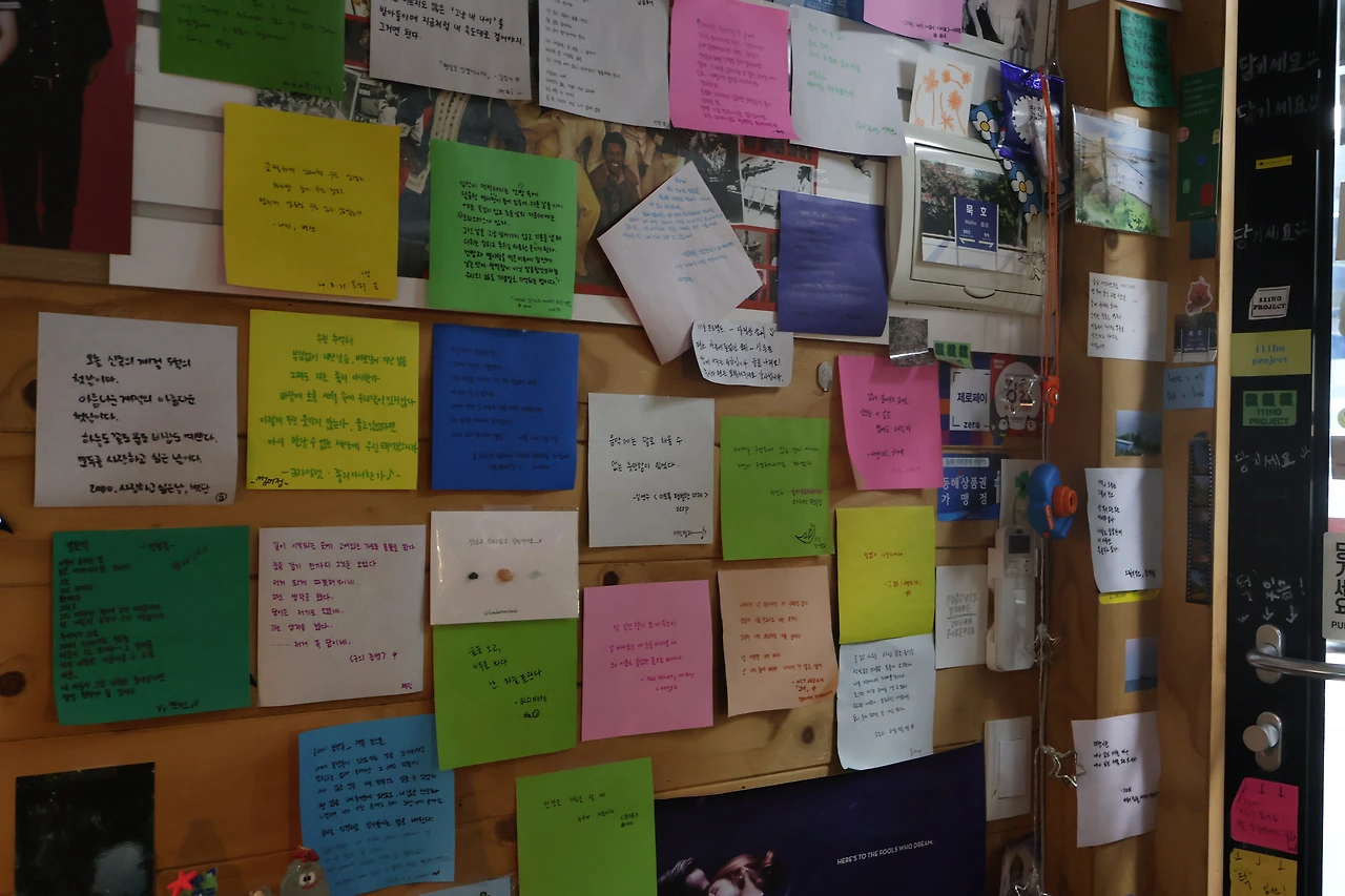 스폿마다 사진도 찍고 잠시 서서 거리와 건물들의 이야기를 들었다. 소품샵에서 반려돌, 조개 모빌 등을 홀린 듯이 구경했다. 느린 우체통에서 편지도 쓰고, 마지막에는 소프트콘으로 마무리했다. 다시 돌아간 111호 작업실은 무인으로 열어두어서, 사람들로 가득 차 있었다. 공간에 비집고 들어가서 촬영하신 사진으로 만든 편지지와 책갈피, 짱구 스티커와 과자까지 가득 선물 받고 투어가 마무리됐다.