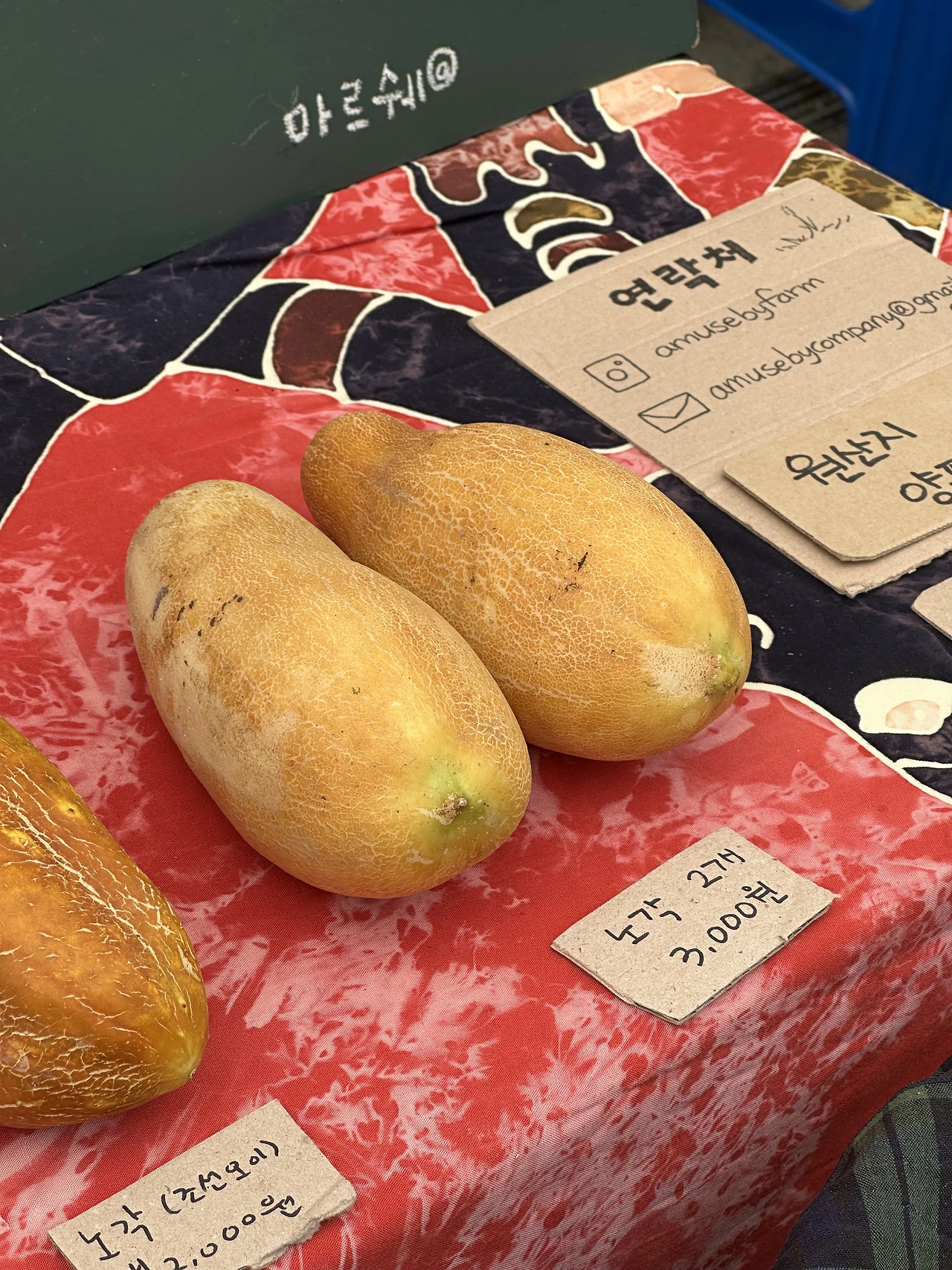 마르쉐 농부시장에 다녀왔어요. 동그란 노각, 작그마한 가지, 단호박 아이스크림까지! 이야기가 담긴 식재료들과 그 이야기를 듣고 싶어 하는 사람들이 모였어요.