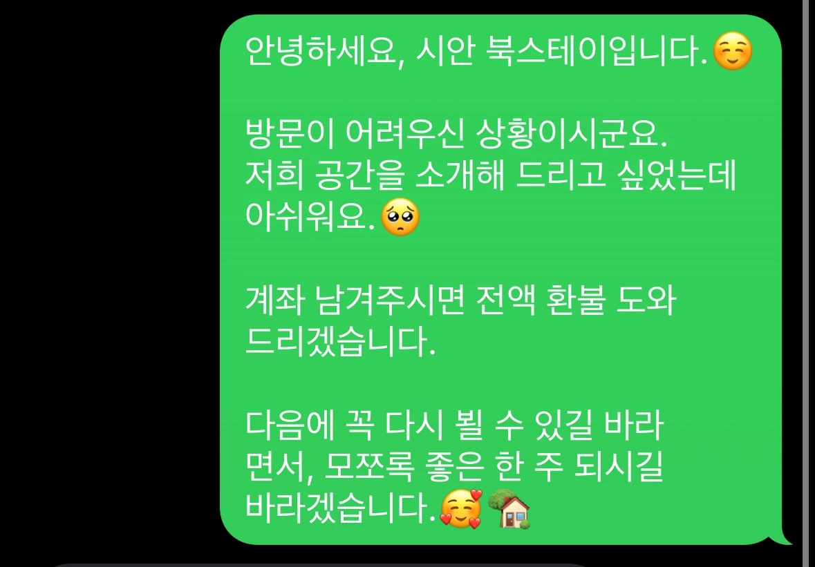 환불에 대해 고민하다가, 다정해지기로 했어요. 예약하실 때 안내한 정책으로는 40%만 환불이나, 전액 환불로 결정했어요. 이제 막 오픈한 우리 집을 알아봐 준 고마운 분이므로. 나중에라도 꼭 공간을 소개해 드리고 싶다고 마음을 담은 인사도 전했어요.