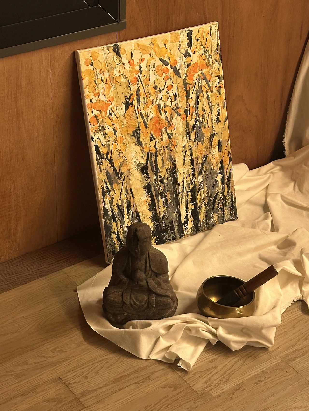 그럼에도 공간의 벽 하나, 마당의 구조물 하나까지 직접 구상하고 고민한 이야기를 들으면서 탐나는 경험이라고, 언젠가 해보고 싶다고 다짐했어요. 계단을 매운 흔적, 경매에서 구매하셨다는 얼굴이 깨진 부처와 당근에서 구했다는 추상화 등 손길이 닿은 흔적이 좋았어요.