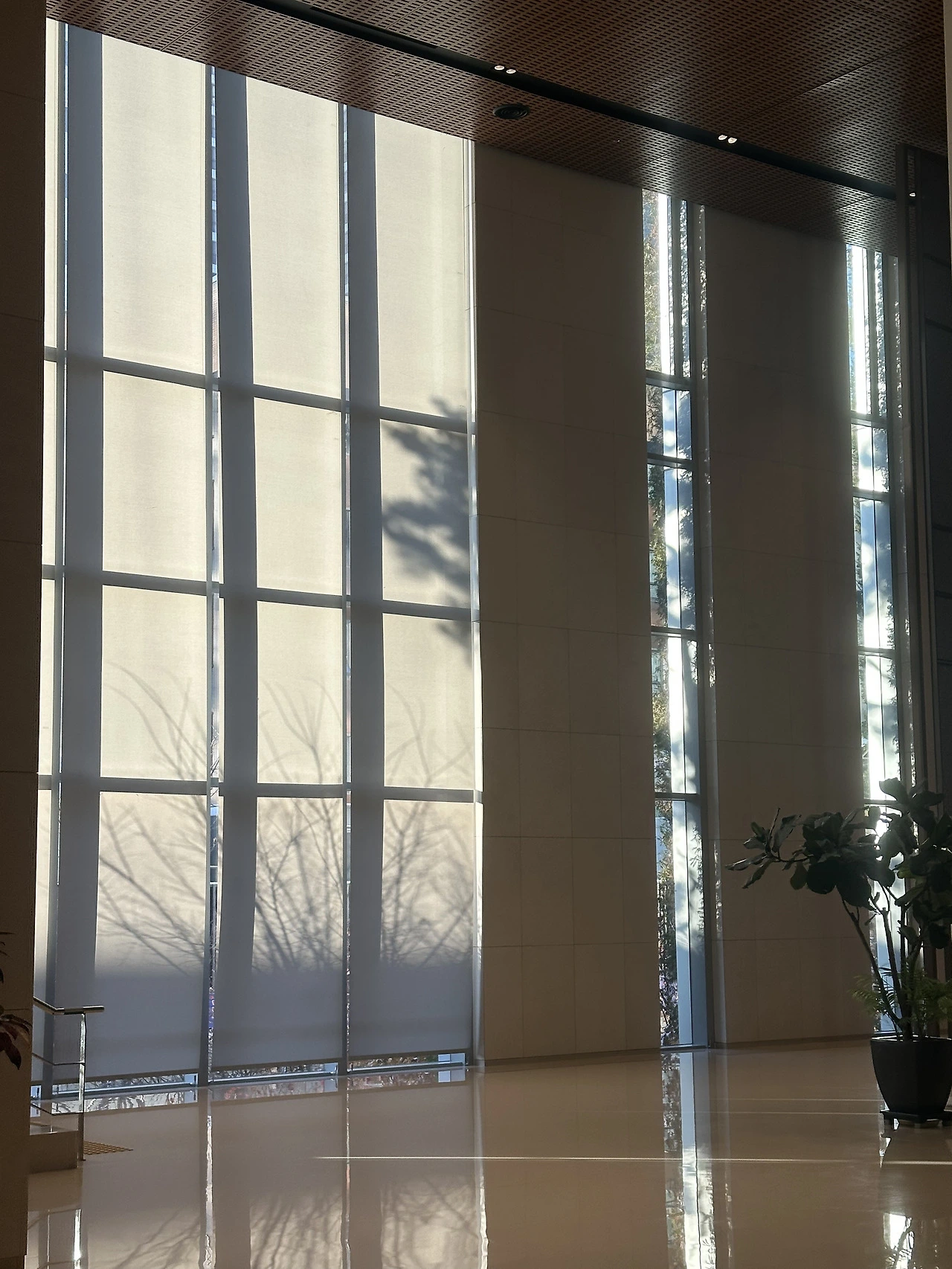 회사 로비 모습이에요. 창에 비친 햇살이 일렁이며 만드는 그림자와 나무와 풀들의 모습이 좋아요.