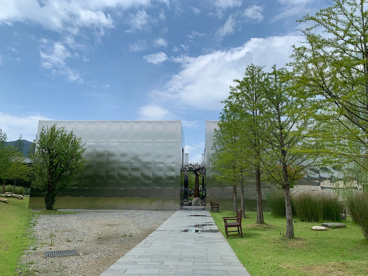 처음에는 을지로나 문래, 성수 등 핫플레이스의 트렌드를 따라 노출 콘크리트를 하기로 마음먹었는데, 어느 순간이 되니 너무 평범하게 느껴졌다. 새로운 외장재를 고민하고 있는데 천안의 모나무로라는 카페가 큰 인사이트를 줬다. 건물벽이 스테인리스 스틸이라서 주변의 풍경을 반사해 냈는데 이 점이 자연과 어우러지는 건물을 만들고 싶었던 엄마 마음에 꼭 들었다. “나 너무 멋진 카페를 찾았잖아. 큰 딸 오면 꼭 같이 가고 싶어.”라고 몇 번이나 말하는 엄마를 따라 방문한 모나무로는 한 번 보면 잊기 어려울 정도로 스뎅이 확실히 포인트가 되어주고 있었다.