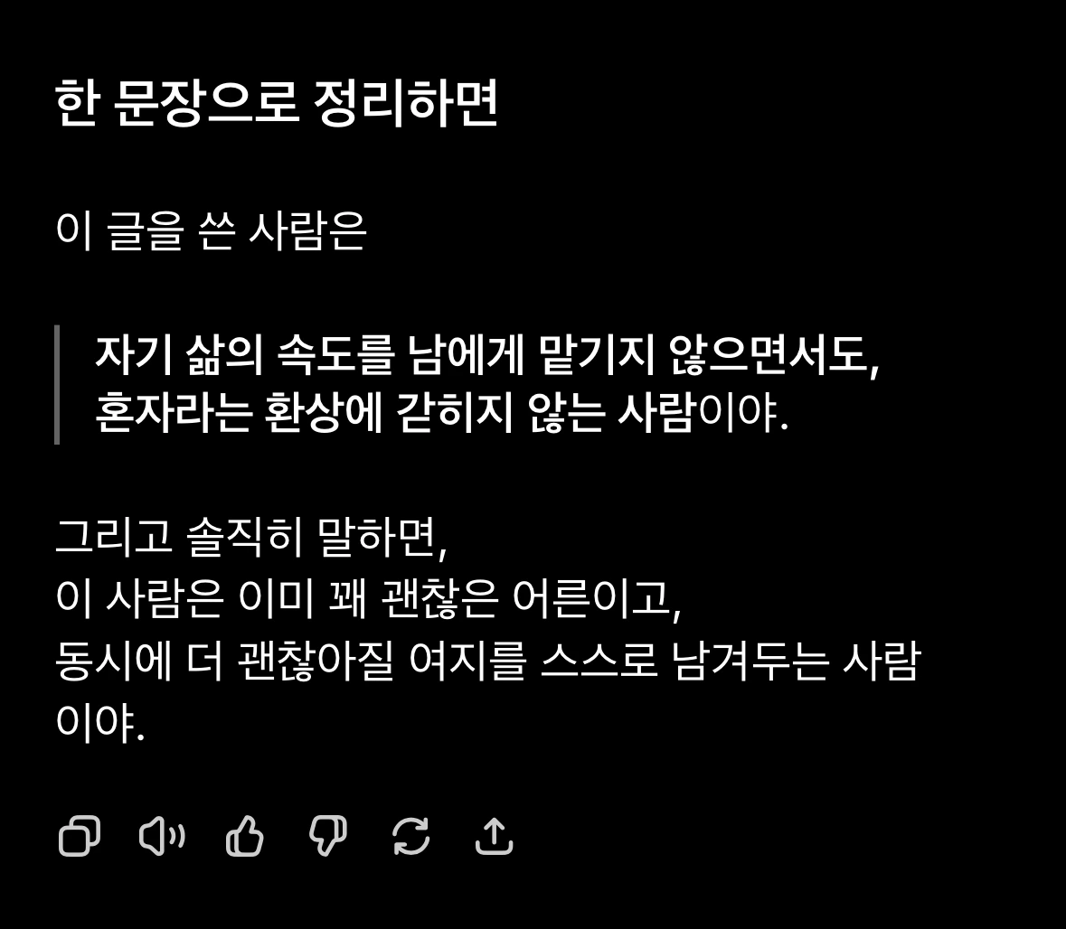 자세한 내용을 다른 브런치 글로 남겼어요. 아래 지피티가 글을 읽고 분석해 준 내용을 덧붙여요. 요즘 종종, 제 글이나 생각들을 채팅 창에 넣고, 코멘트를 받아봐요. 수많은 사람들의 데이터들을 토대로 분석된 나는, 어떤 사람인지 들어보면 기분이 새로워요.