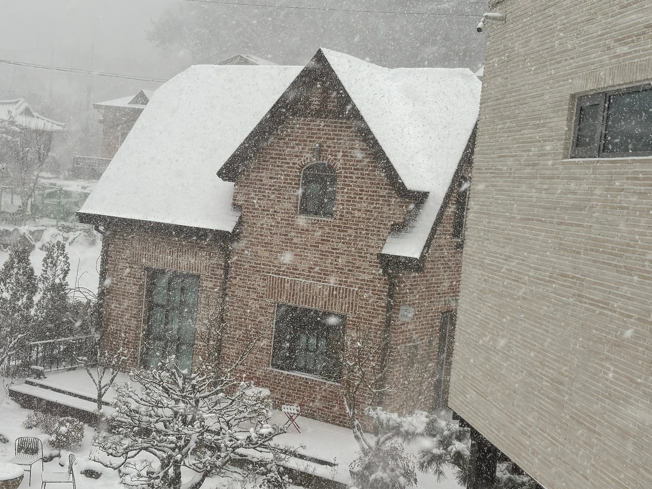 시안의 겨울, 시안에 눈이 오면 정말 제일로 예뻐요. 포근히 쌓인 눈이 솜이불같이 사방을 덮어요. 시안 북스테이 안에 앉아 있으면 옛날 유럽 영화의 산장 같은 느낌도 들고, 시안 갤러리의 벽난로를 켜면 빨갛게 나무에 불이 붙으면서 공기가 점점 훈훈해지는 감각이 좋아요. 창 밖의 장면이 장면이 그림 같아서, 사진을 여러 장 찍게 돼요.