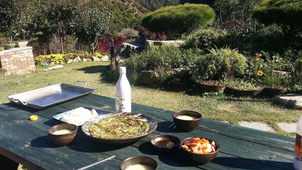 날이 좋은 날 이웃집에서 준비해준 막걸리와 파전