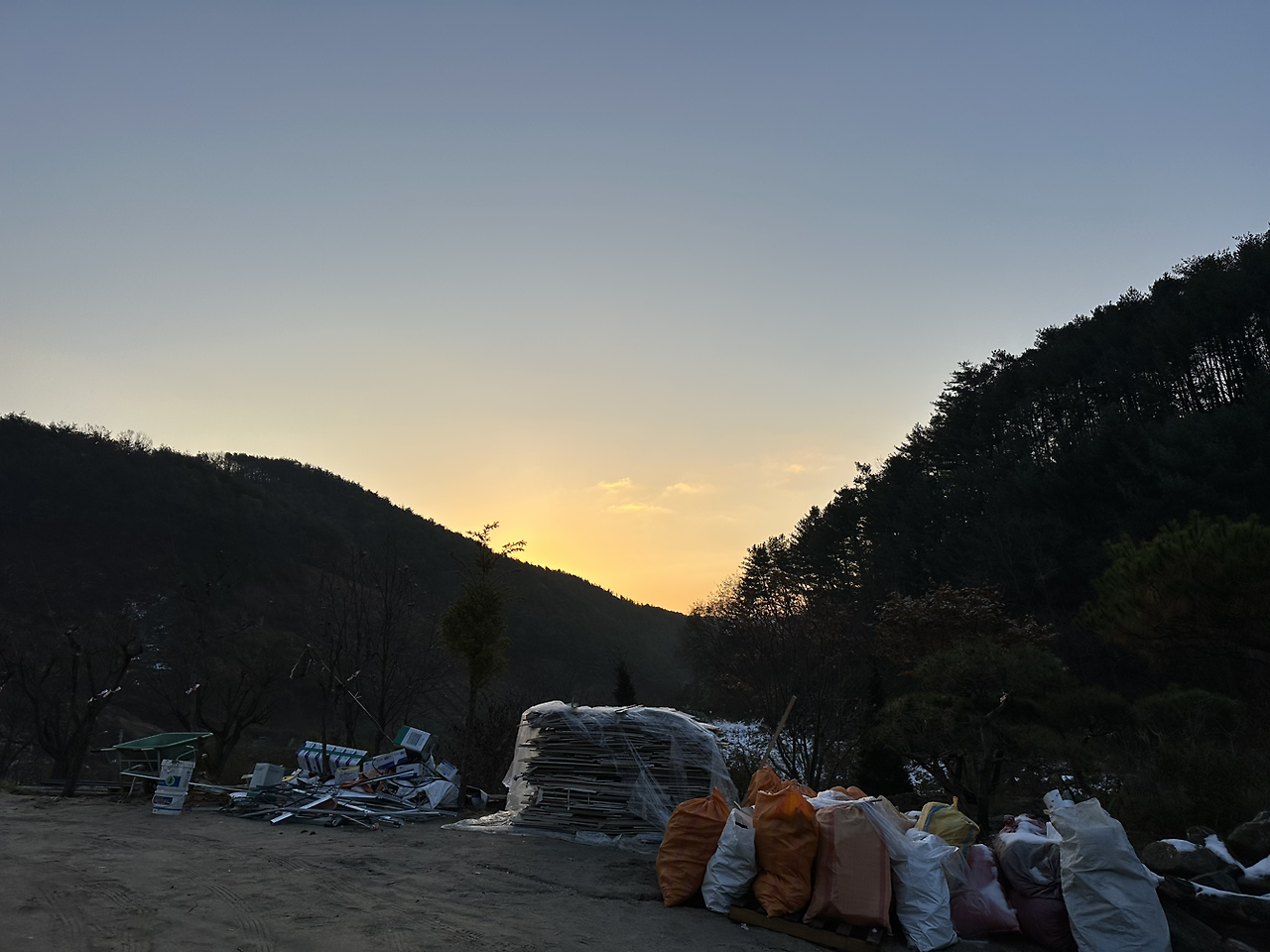 아침해가 뜨는 모습과 그 앞에 작업 현장을 청소해 놓은 흔적들
