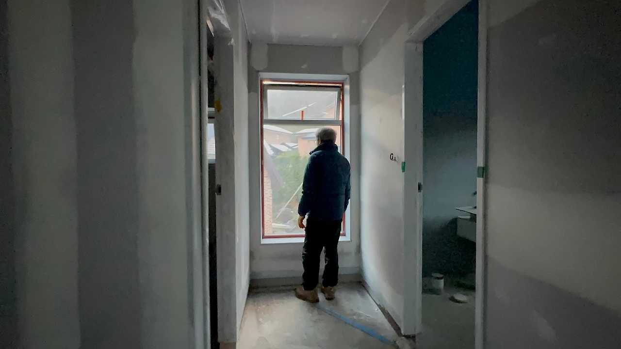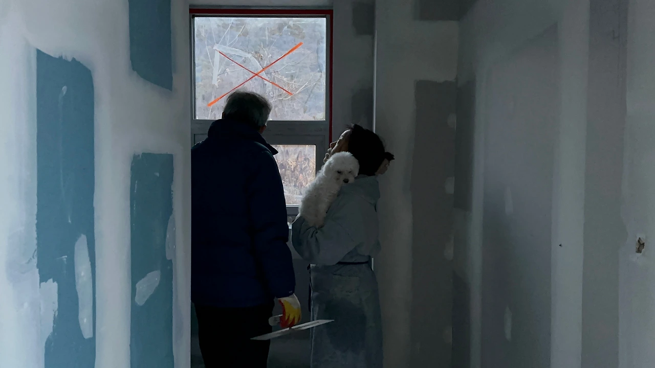 신축 집에서 구축을 보고 있는 아빠의 뒷모습