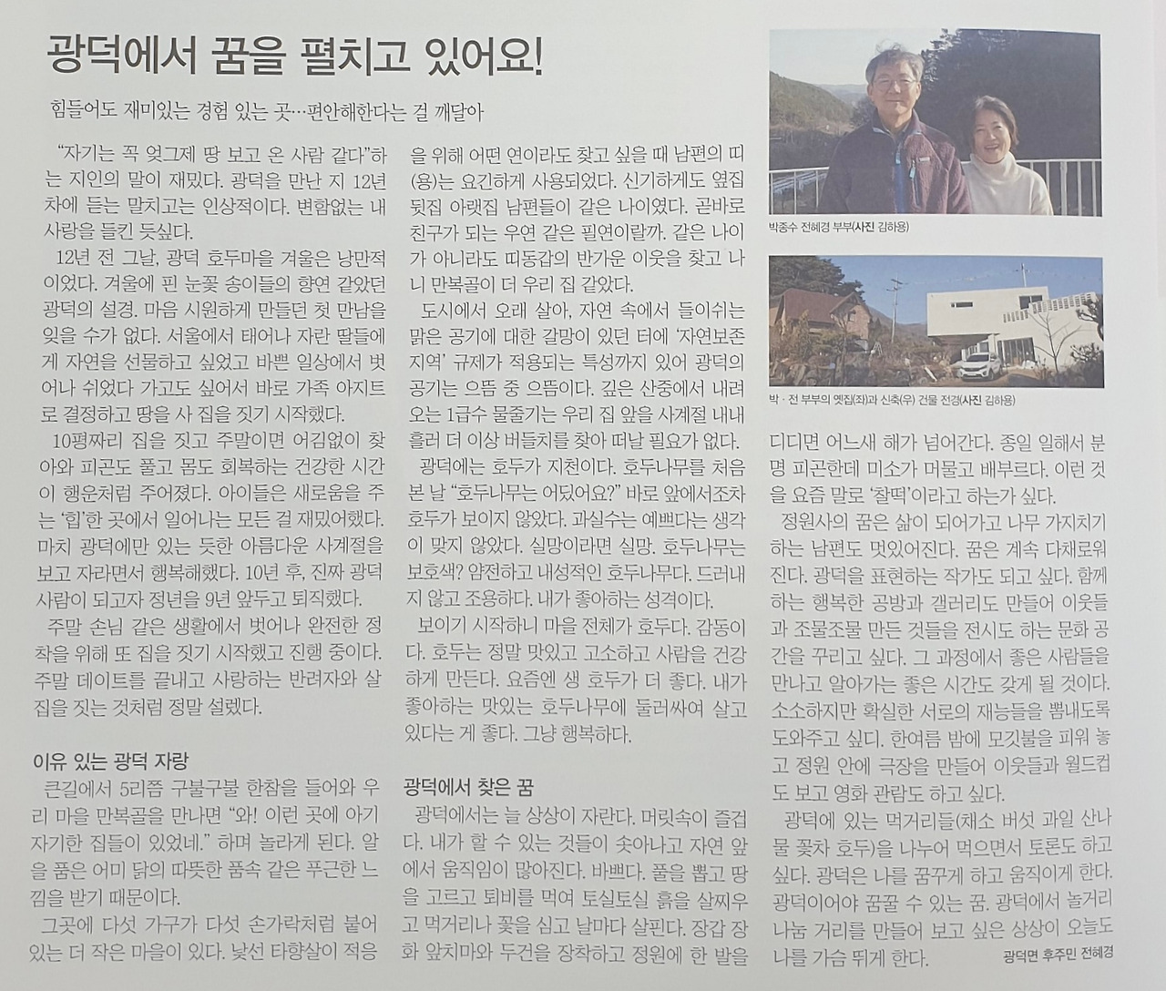 어느 날 광덕의 이야기를 전하는 신문 창간호에 엄마의 이야기를 싣자는 감사한 제안이 왔다. 수개월을 지어지는 중에 있던 집, 언제 끝날지 동네 사람들 모두가 궁금해했는데 드디어 완성이 되었으니 왜 지었는지, 집주인은 누구인지 이야기를 해보자는 거다.