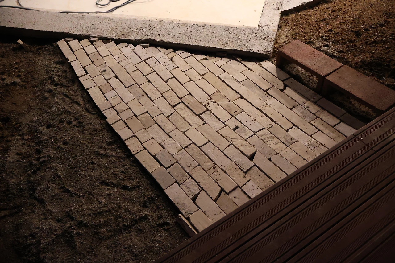 신축이 다 지어지고 나서 구축 테라스를 뜯어내고 나서야, 그렇게 눈이 오나 비가 오나 마당에서 기다리고 있던 파벽돌들이 제 역할을 부여받았다. 구축과 신축을 잇는 테라스 옆 흙바닥을 예쁘게 메꿔주는 것이었다. 작고 부서진 벽돌들은 끝에 모서리를 채우기에 제격이었고, 길쭉한 모양을 유지하고 있는 벽돌들이 중심을 잡아주었다. 감성도 비용도 모두 잡은 행복한 재활용들은 그렇게 집 곳곳의 빈 공간들을 특별하게 해 줬다.