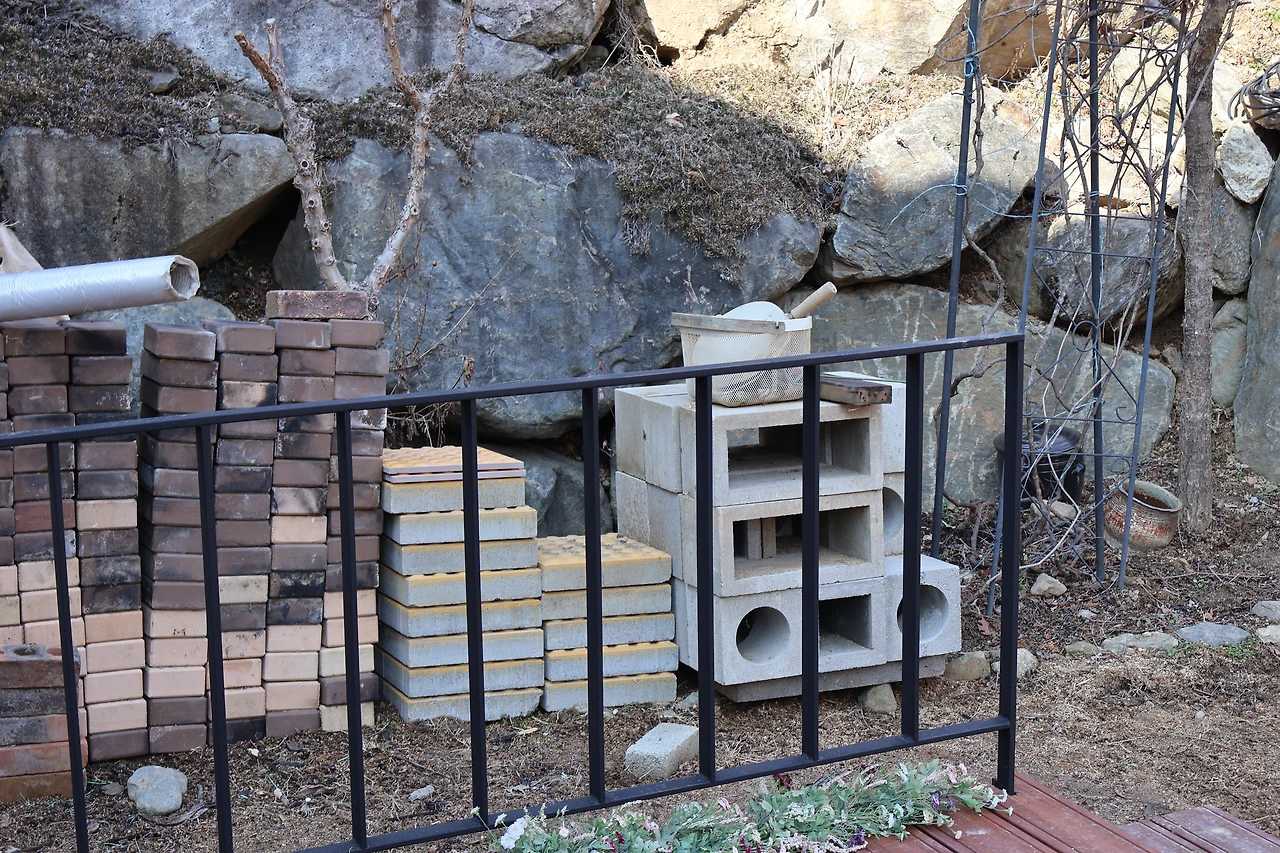 직영 방식으로 건축을 하면서 자재비를 낱낱이 알게 되니 버리기보다 어떻게든 사용할 생각을 하게 된다. 건축은 끝났지만 아직 정원이 가꾸어지기 전인 마당 곳곳에서 부모님이 정리한 자재들을 찾을 수 있다. 주인이 제자리를 찾아주길 기다리며 옹기종기 마당 한구석에 모여 있는 각종 벽돌들, 땅을 고르게 정리하며 나온 거대한 돌덩이들은 혼자는 버려지는 쓰레기지만 모아놓으면 꽤나 든든하다. 분명히 나중에 자신의 역할이 있을 거라고 가만히 기다리는 마음씨 좋은 일꾼들 같다.