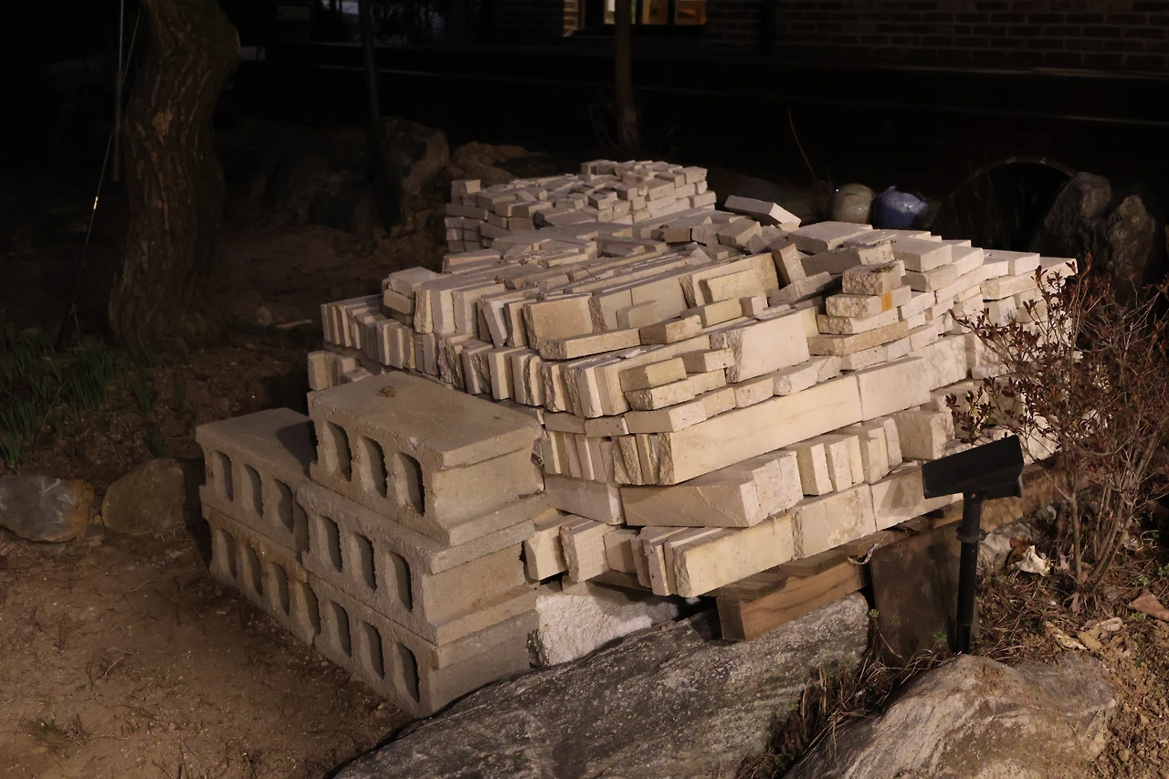 바로 새로운 쓸모를 찾은 철문과 달리, 쓰고 남은 파벽돌들은 상대적으로 오랜 시간 마당에서 자리를 지키고 있었다. 돌끼리 부딪혀 붙어있는 매지를 떼고 물로 씻어 가지런히 놓기까지 손이 꽤 많이 갔지만 분명 쓸 일이 있을 거라는 생각에 가지런히 모아두었다.
