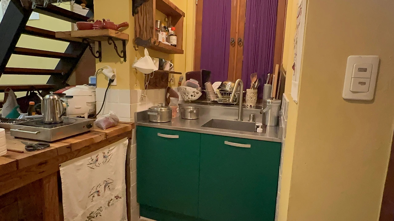 온 벽이 노란색으로 칠해진 집에, 보라색 커튼이 걸려 있다. 들어서면 원색이 주는 에너지와 생기가 집 안을 가득 채운 느낌을 받게 된다. 그런 집에 초록이 추가되었다. 창 밖으로만 보이던 녹음의 색을 그대로 가져와 부엌 싱크 문에 담았다.