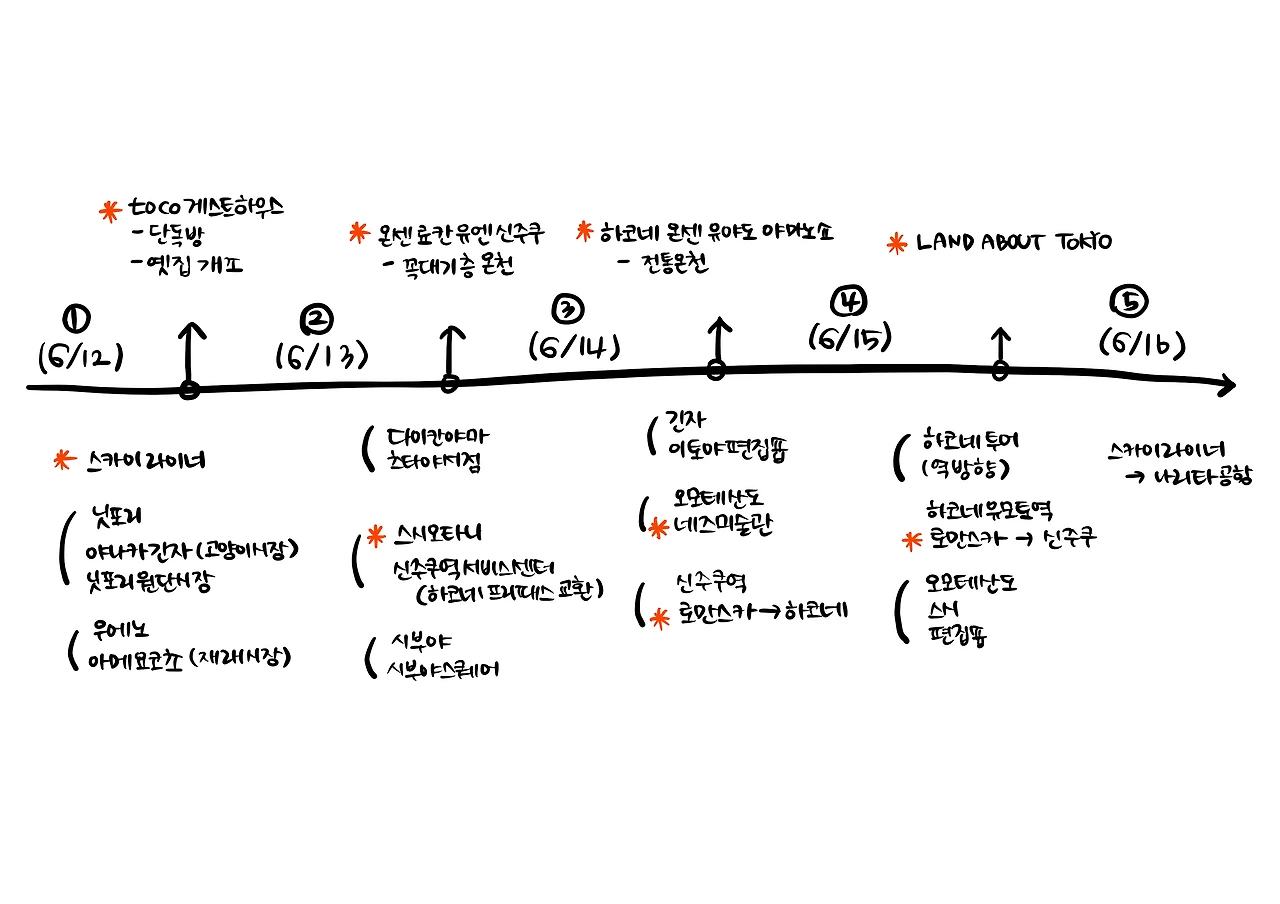 관광지를 갈 생각이 없으니, 일정은 모두 자유여행이었다. 하루를 알뜰살뜰 보내는 걸 좋아하는 성향이 그대로 여행 계획에 반영됐다. 나리타 공항과 스카이라이너로 이어지는 우에노, 닛포리로 시작해서 긴자, 시부야 등 주요 도시들을 가고, 네즈미술관이 있는 오모테산도와 츠타야서점 본점이 있는 다이칸야마를 추가했다. 온천 2번, 오마카세 1번을 가고, 재즈바도 1곳은 꼭 가기로 야무지게 일정을 짰다.