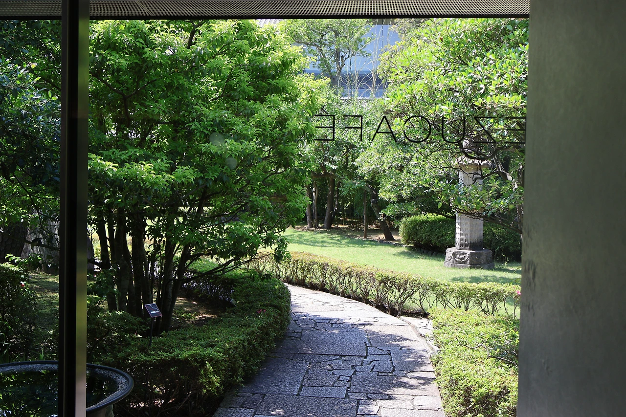 곧이어 바쁜 일정 속에서도 꼭 가보고 싶었던 네즈미술관의 카페에 들어섰다. 한지 같은 재질로 된 천장에서 들이치는 햇살, 사방의 창으로 비치는 초록의 정원이 아름다웠다.
