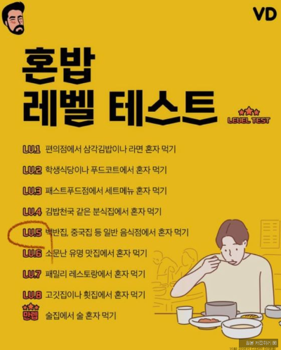 번외로 나의 이십여 년 혼밥 역사 중에 가장 힘들었던 혼밥 장소는 다름 아닌 결혼식장이다. 결혼식에는 보통 차려입고 가고, 좋은 가방을 들고 가는데 대부분의 결혼식장은 둥근 테이블로 배치된 뷔페식이 많다. 내 자리라고 표시하기 위해 가방을 테이블에 올려놓고 가자니 비싼 가방을 분실하거나 음식이 묻을까 염려되고, 가방을 들고 음식을 담기에는 손의 자유를 제한하여 불편하다. 사정상 딱 두 번 결혼식장에 혼자 간 적이 있는데 두 번 다 혼밥 하기 너무나 힘들었다. 아마 저 이미지를 만든 사람이 MZ세대 거나 결혼식을 많이 경험해보지 못해서 빠진 게 아닐까 싶다. 참고로 장례식장은 괜찮다. 혼자 온 사람은 상주가 더 잘 챙겨준다.