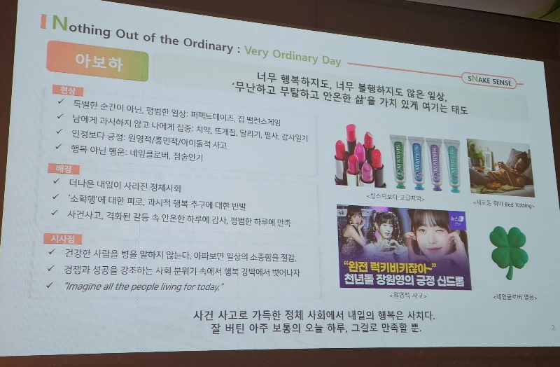 '별다줄(별 걸 다 줄인다)'의 영향으로 수많은 줄임말이 나왔지만 ‘소확행(소소하지만 확실한 행복)’. 이 말을 모르는 사람은 이제 없지 않을까? 여기서 한걸음 더 물러선 ‘아보하(아주 보통의 하루)’가 2025년 대한민국 트렌드를 이끌 단어로 선정되었다(by 트렌드 코리아 2025).