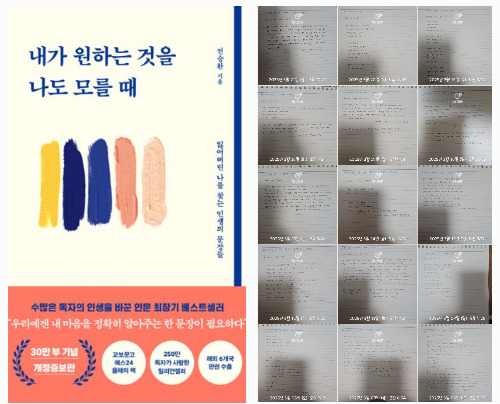 필사는 계속 '내가 원하는 것을 나도 모를 때'로 하고 있다. 십 여분 남짓 글씨 쓰는 것도 쉽지 않았는데 그래도 꾸역꾸역 이어나가고 있다. 글씨도 처음에 비해 괴발개발 난리도 아니다. 필사를 하면서 계속 생각한다. 다들 필사를 찬양하는데 나만 그 맛(!)을 모르는 건가. 요즘은 그냥 의무적으로 하는 것 같다. 그래도 '쓰는 인간'으로 거듭나기 위해 오늘도 써보자!