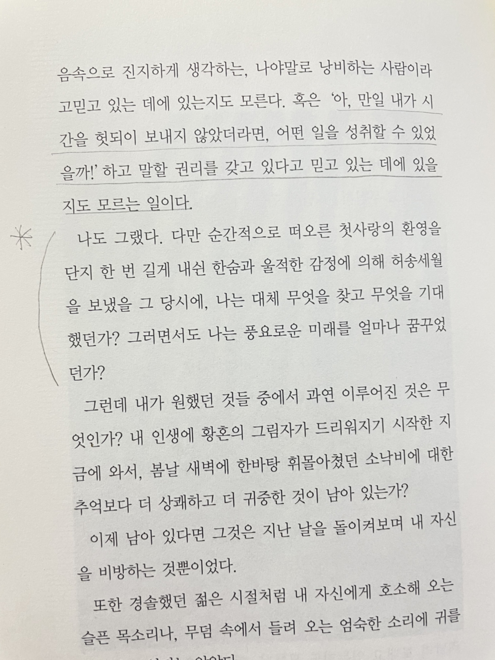 순간적으로 떠오른 첫사랑의 환영을 단지 한 번 길게 내쉰 한숨과 울적한 감정에 의해 허송세월을 보냈을 그 당시에, 나는 대체 무엇을 찾고 무엇을 기대했던가? 그러면서도 나는 풍요로운 미래를 얼마나 꿈꾸었던가?