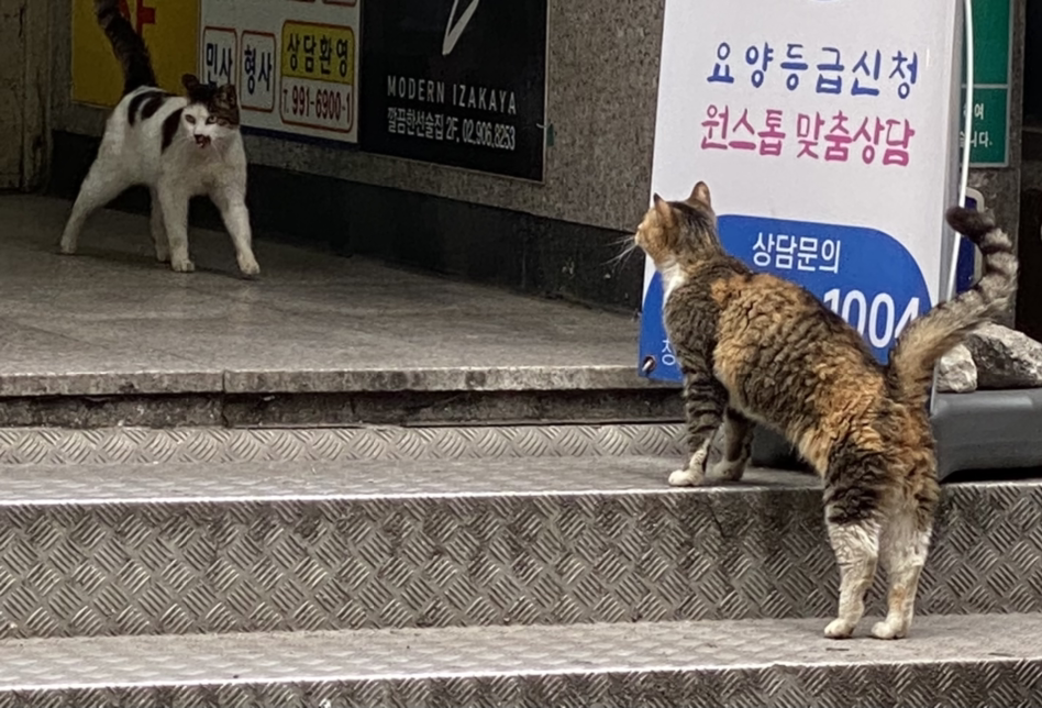 몇 시간 쯤 지났을까. 배가 고파서 그만 정리하고 나갈까 하다 유리창 너머로 재미있는 걸 목격한다. 고양이 두 마리가 3분 간격으로 상가 앞에 모였다. 얼룩이가 먼저 왔고, 노랑이가 늦었다. 일찍 온 얼룩이가 심통난 표정으로 늦게 온 노랑이를 향해 걸어오는 장면이 귀엽다. 스마트폰 없이도 같은 시간 한 자리에 모이는 이 친구들, 신기하다.