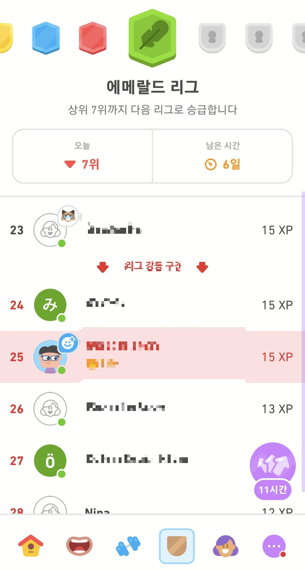 <듀오링고>에서는 각 리그에 따른 랭크를 보여준다. 오늘 하루 문제를 풀면 그 개수에 따라서 경험치를 제공한다. 그 경험치가 쌓여서 내 등수가 된다.