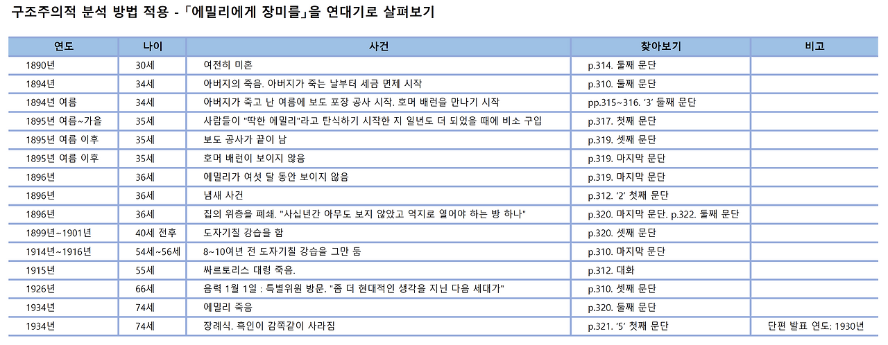 에밀리의 나이에 맞추어서 연대기를 정리하였다. 그렇지만 위의 표의 "찾아보기"를 보면 알 수 있듯이, 시간의 순서대로 글이 전개되지 않음을 알 수 있다. 꽤나 복잡한데, 구조주의적 분석 방법에 의해서 접근을 하면, 「에밀리에게 장미를」이 매우 정교하게 짜여있는 글이라는 것을 알 수 있게 된다.