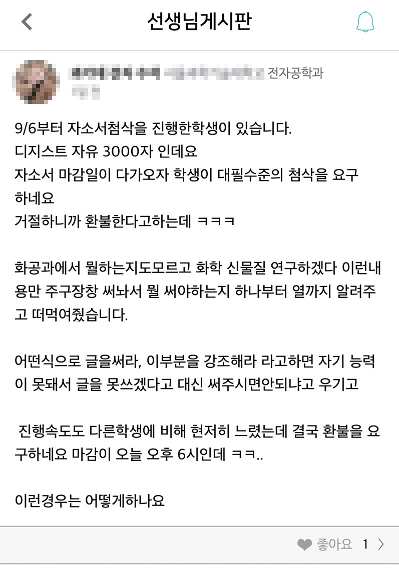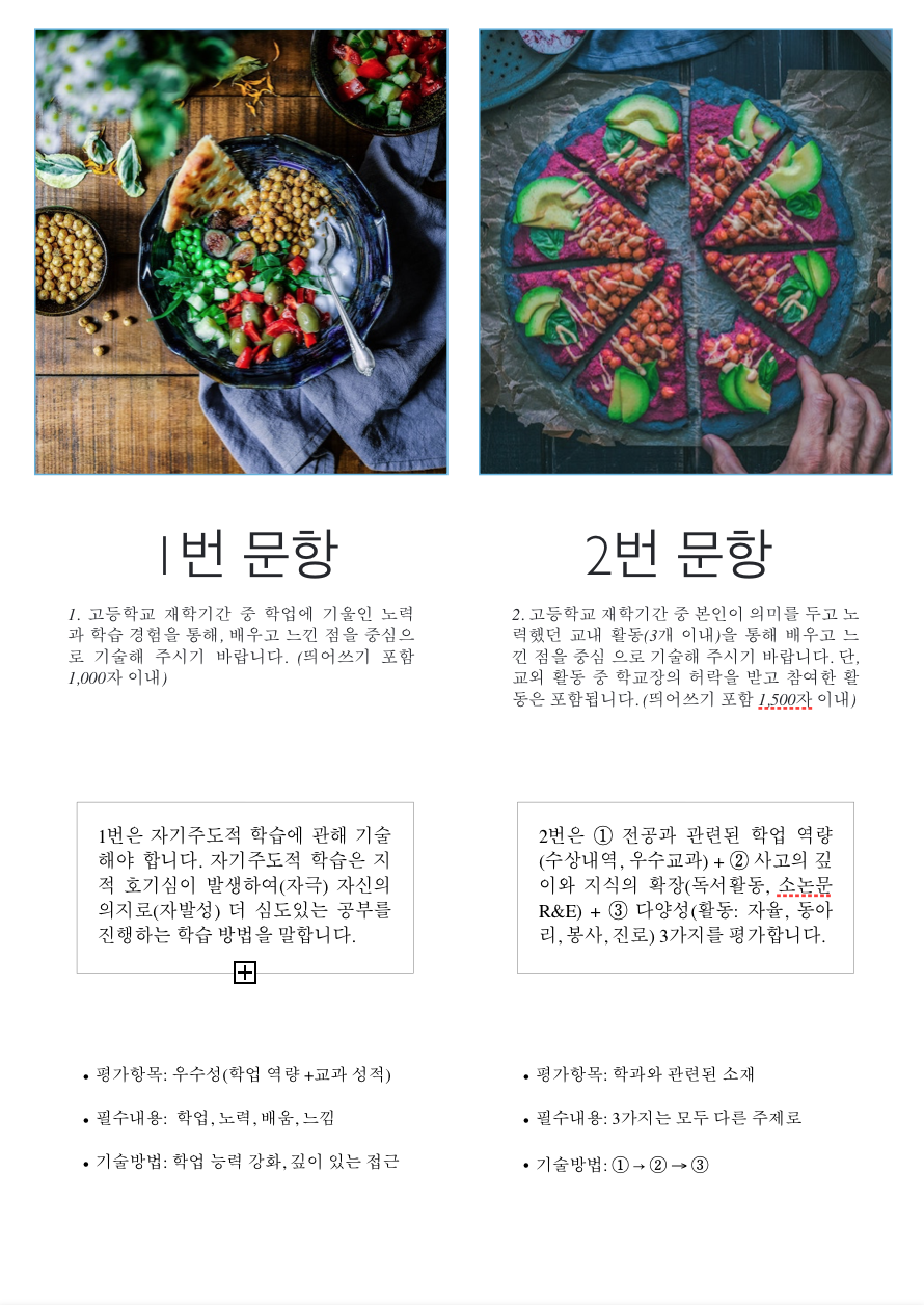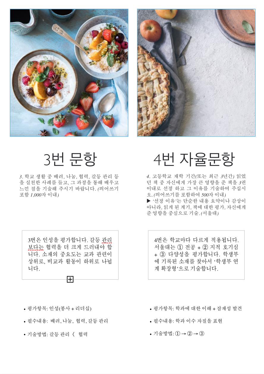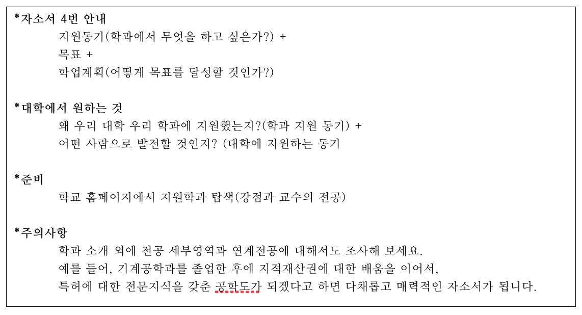 두 번째 수업에서는 학생의 글을 읽고 함께 토론하는 시간을 갖는다. 글의 의도나 목적, 어떤 부분을 강조하고 싶었는지, 제일 하고 싶은 이야기는 무엇인지 묻는다. 그리고 대교협에서 정한 항목 1번에 대해서도 이야기를 나눈다. 대교협에서 정한 질문은 3개이다. 1번과 2번과 3번은 모든 대학이 동일하다. 4번 항목이 있는 학교도 있고 없는 학교도 있다. 4번 항목은 학교마다 다르지만, 거의 비슷하다. 아래는 자소서 질문이다.