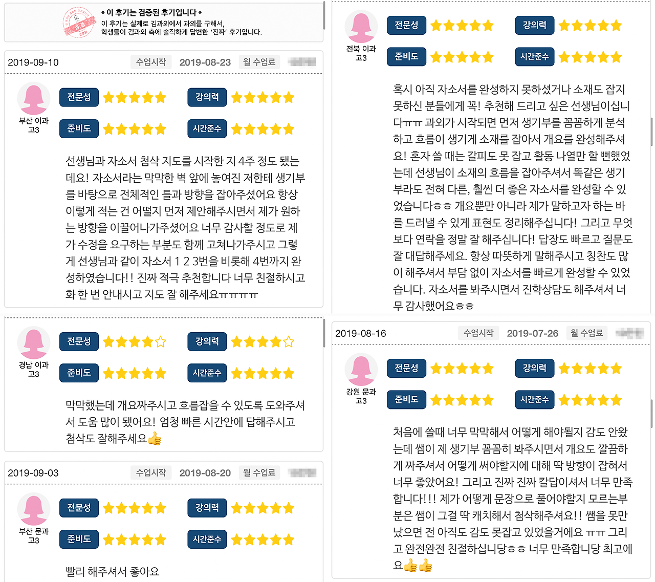 아래 사진은 김과외 앱에서 자소서로 유명한 교사의 수업 후기이다. 수업 후기를 보면, 개요 작성을 돕고 글을 매끄럽게 만들어 주는 방식으로 진행하는 것 같다. 학생들은 이 부분에 큰 매력을 느낀다고 말한다.