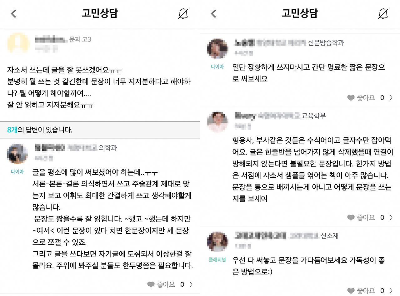 아래 사진은 김과외 앱에 올라온 것 문의 내용이다. 문과 고3 학생이 올린 글에, 대학생 과외 교사가 댓글을 달아주었다. 학생은 자신이 글을 잘 쓰지 못한다고 도움을 달라고 문의한다. 학생은 자신이 글을 잘 쓰지 못하는 이유를 문장력에서 찾고 있다. 대학생 과외 교사들도 글을 쓰는 데에 제일 중요한 것이 문장의 호응이나 문장력이라고 생각하는 것 같다. 그렇다면 정말 문장력이 좋지 않아서 글을 매끄럽게 작성하지 못하는 것일까?