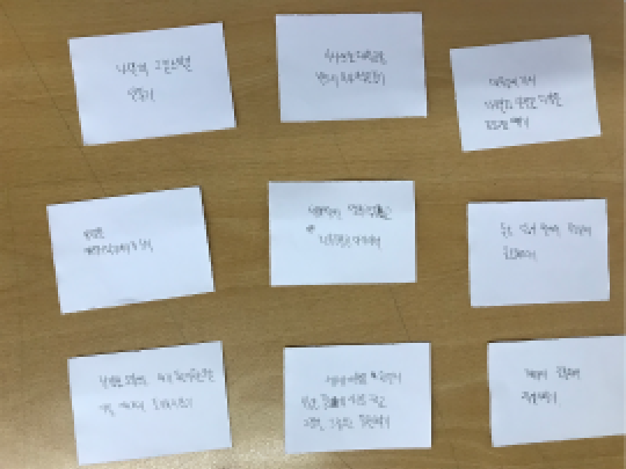 카드 게임은 창조적 가시화 작업의 첫 번째 단계인데, 자신이 원하는 것을 스스로 확인하는 작업이다. 이 작업을 하면서 이야기는 풍성해진다. 이전까지 자신이 알지 못하는 자신에 대해서 알게 되는데, 이 작업을 끝내면 학생은 놀라워한다. 이 작업이 끝나면 자신이 생각하고 있었던 것이 어떤 것인지 분명하게 알게 되고, 무엇을 중요하게 여기는 사람인지 알게 되며, 자소서에 무엇을 집중해서 써야 하는지 알게 된다.