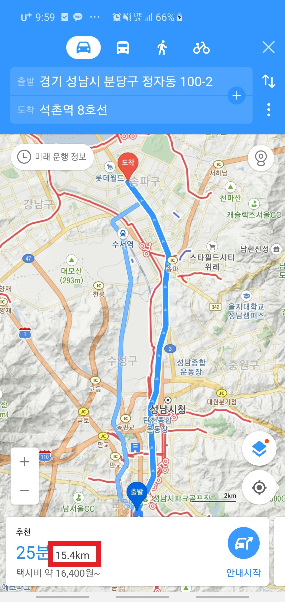 '자동차'로 선택했을 시, 실시간 교통정보를 포함하여 추천받은 탐색거리는 '2.14km'이다.