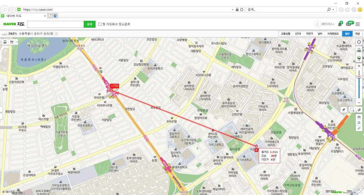 내비게이션이 아닌 지도에서 '석촌역'에서 '석촌중학교'까지의 거리를 탐색해 보았다.