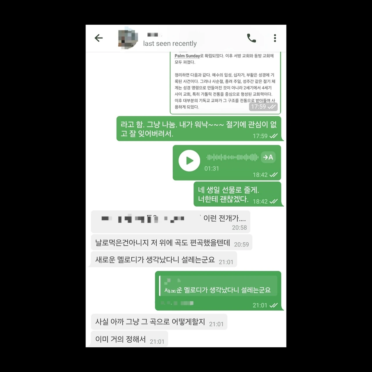 "혹시나 하고 피아노 앞에 앉았는데, 앉자마자 멜로디를 주셔서, 아무래도 우리가 할 곡은 새로운 곡이 될 것 같다. B minor이고 네 파트는 멜로디 위주가 될 거야. 내가 인내를 가지고 앉아 있으면 바로 다 지을 수도 있는데, 지금 인내심이 없어, 집중력이. 어떤 곡인지는 다 알아들었거든. 근데 악보 정리를 해야 할 것 아니야. 악보를 네게 써 줘야 되고 나도 반주를 해야 되니까.. 그래서 시간이 좀 필요할 것 같아."