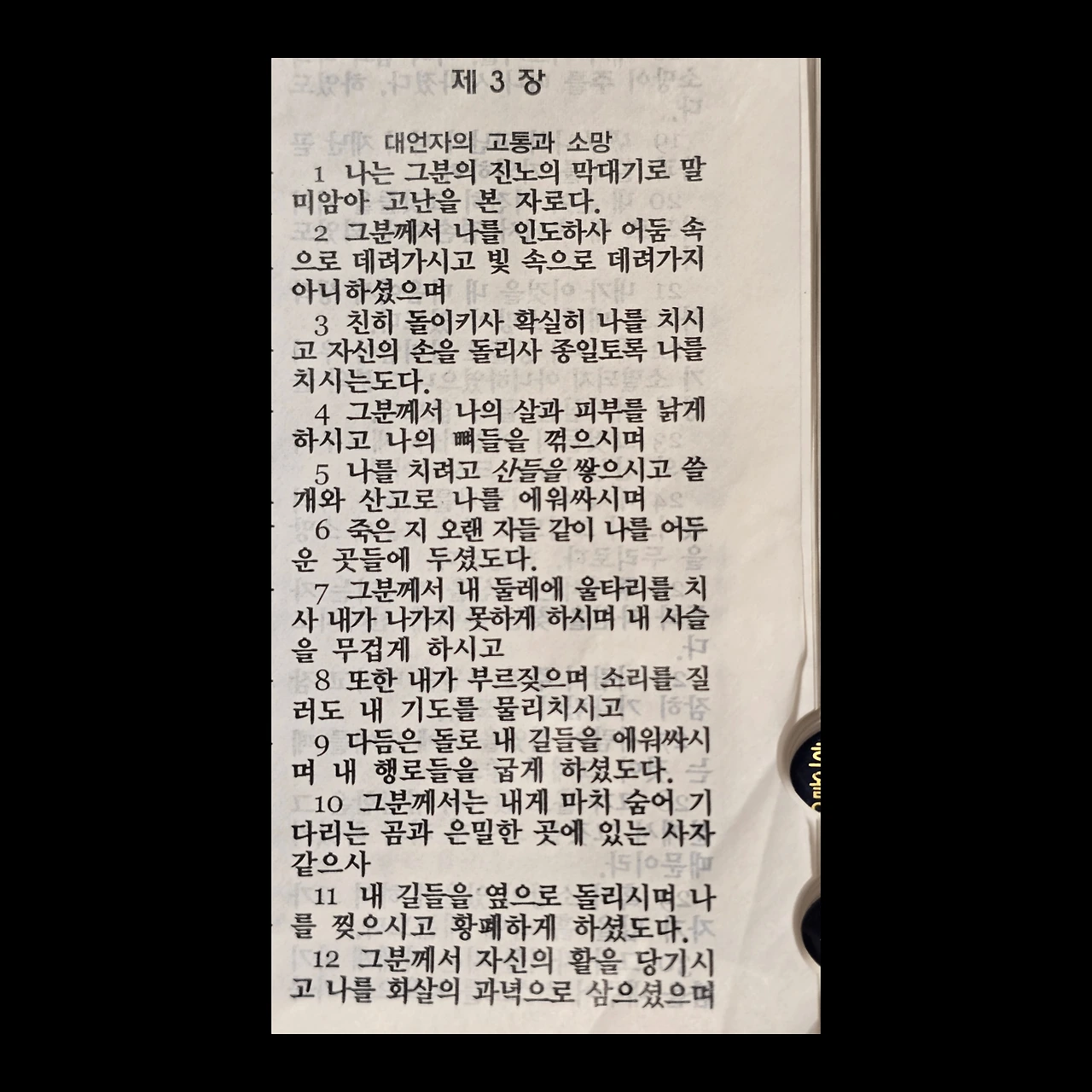 제목도 몰라 묻자, 신은 내게 예레미야 애가 3장을 주었다. 읽지 않았고 읽고 싶지 않은 애가 3장 전체는 바로 나의 이야기였다. 뼈가 지속적으로 산산조각 나 으스러지는 히브리어 표현, 모욕과 치욕, 억울함과 파멸, 황폐와 멸망으로 눈물이 강같이 흐르기까지, 하나도 나의 이야기 아닌 것이 없었다. 나는 그의 "진노의 막대기를 본 자"였다.
