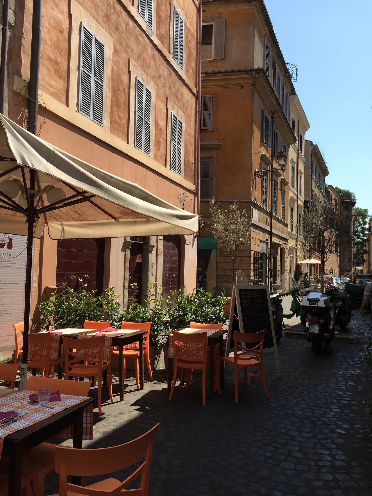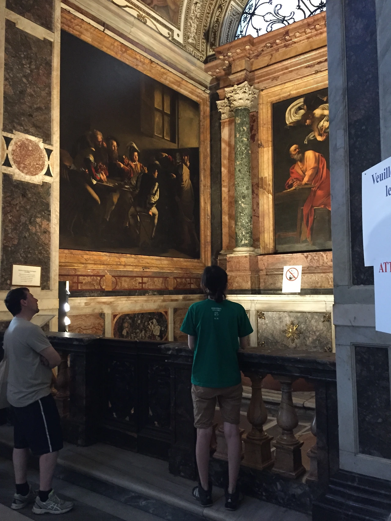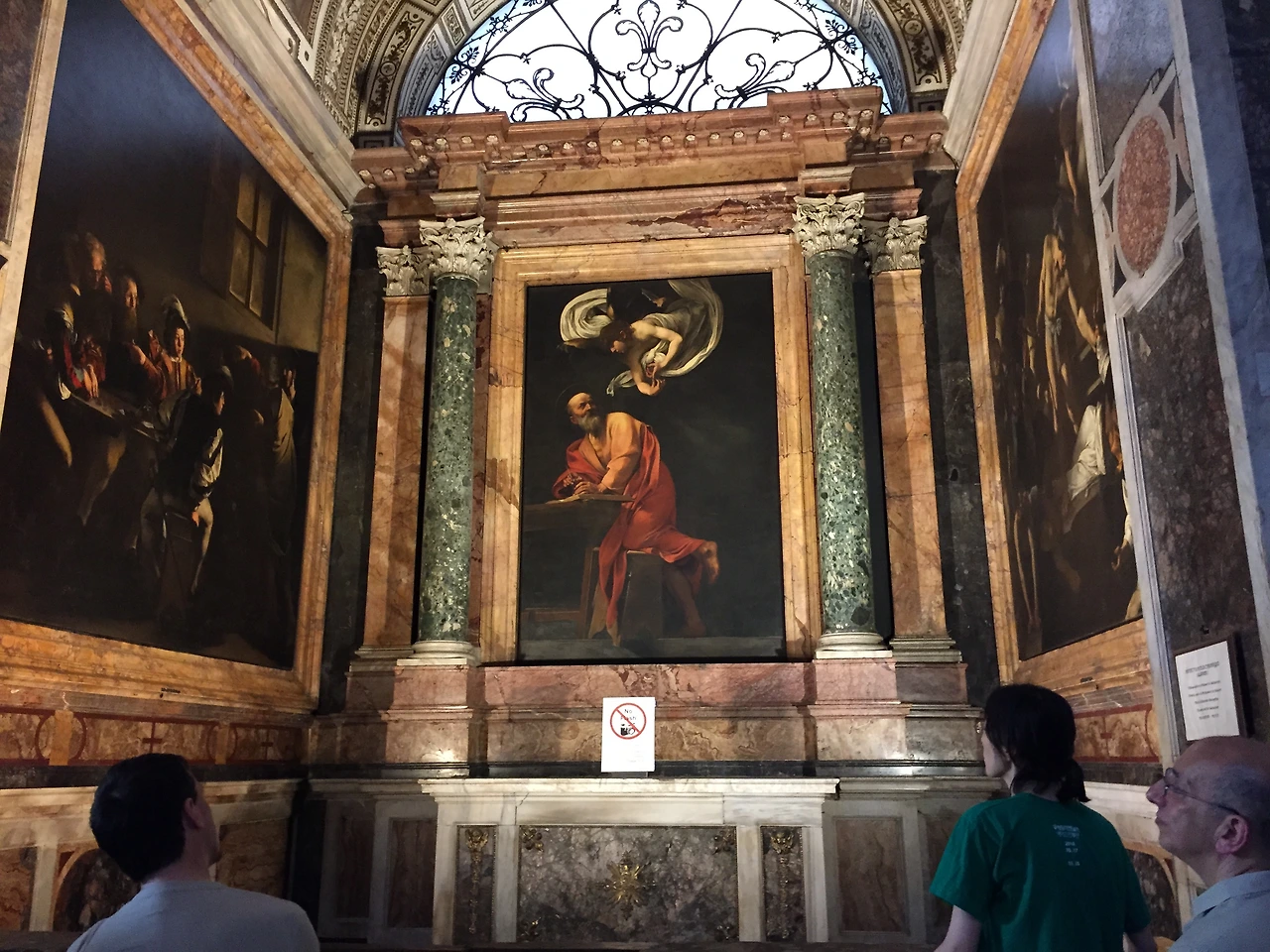 교과서가 갖는 함정(?)이 현지에선 이렇게 잘 드러난다. 종이 위에서 그림만 보는 것과 전체 환경 속에서 감상하는 것은 이렇게 차이가 나는구나. 이 그림은 세리였던 성 마태가 예수님(오른쪽)의 부름을 받고 놀라는 장면을 묘사하고 있다. 당대 로마인들의 모습이 세밀하게 묘사되어 있는데, 빛과 어둠으로 구성된 극적인 장치가 이 장면을 비현실적인 무대로 바꿔준다. 묘사가 사실적이어서 이 순간의 신비함이 더 크게 다가온다. 도판만 보고 짐작했던 것보다 더 강렬한 작품이다! 그리고 이들이 앉아있는 저 골목의 풍경은 내가 로마 곳곳에서 보았던 바로 그 야외 테이블이어서 놀랐다. 연한 갈색의 벽조차도 똑같다.