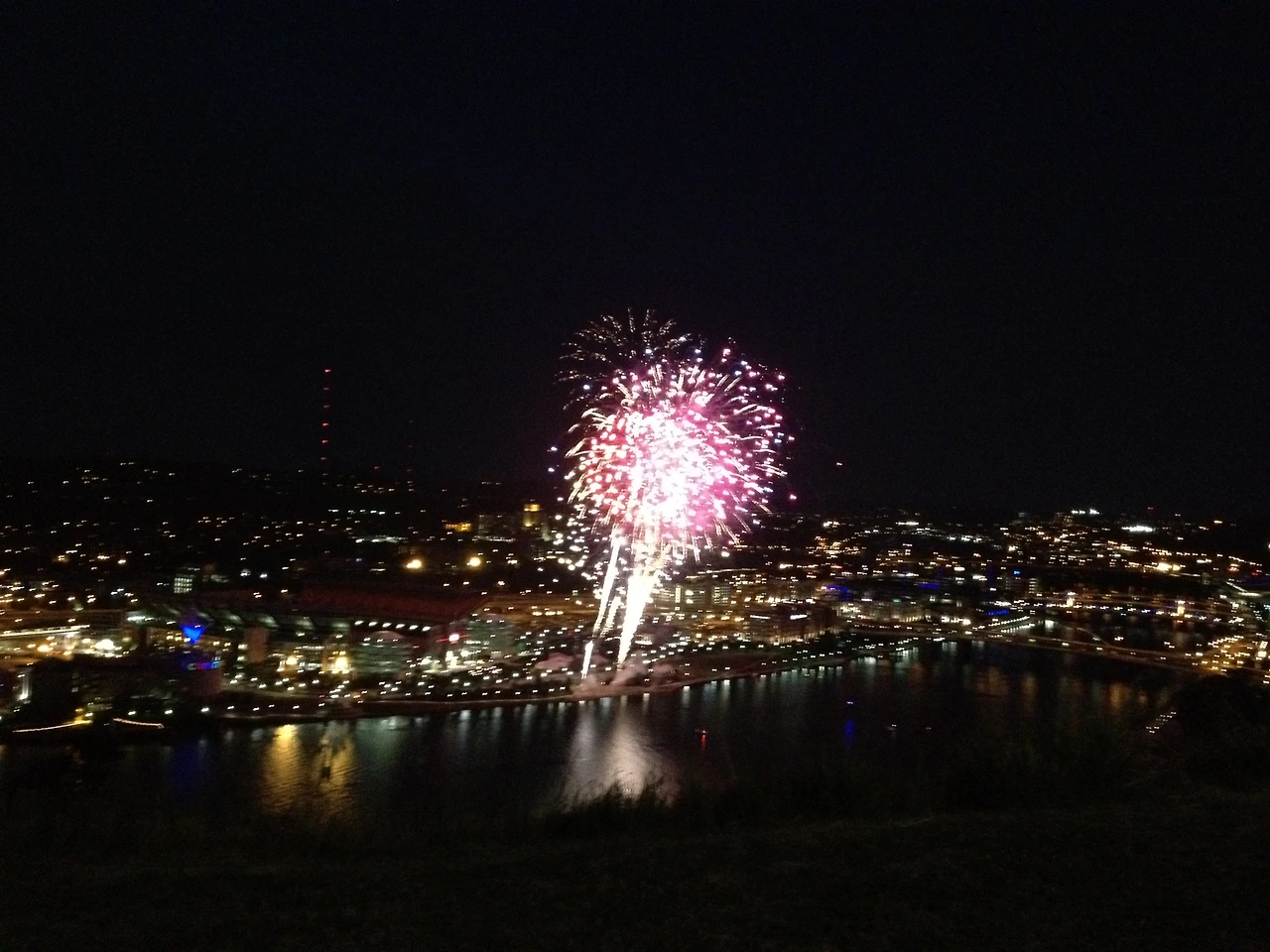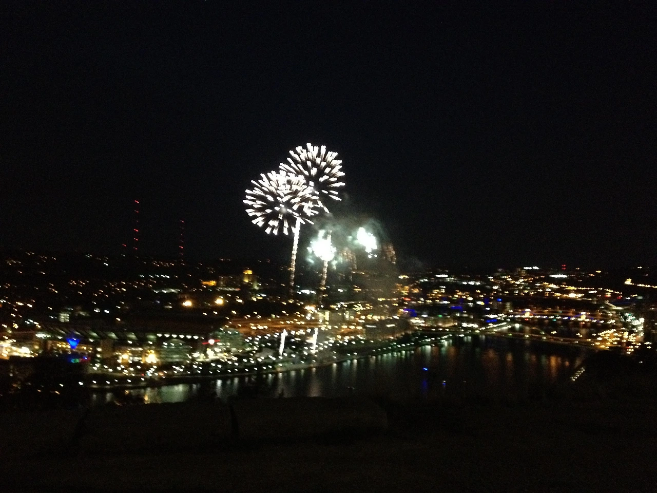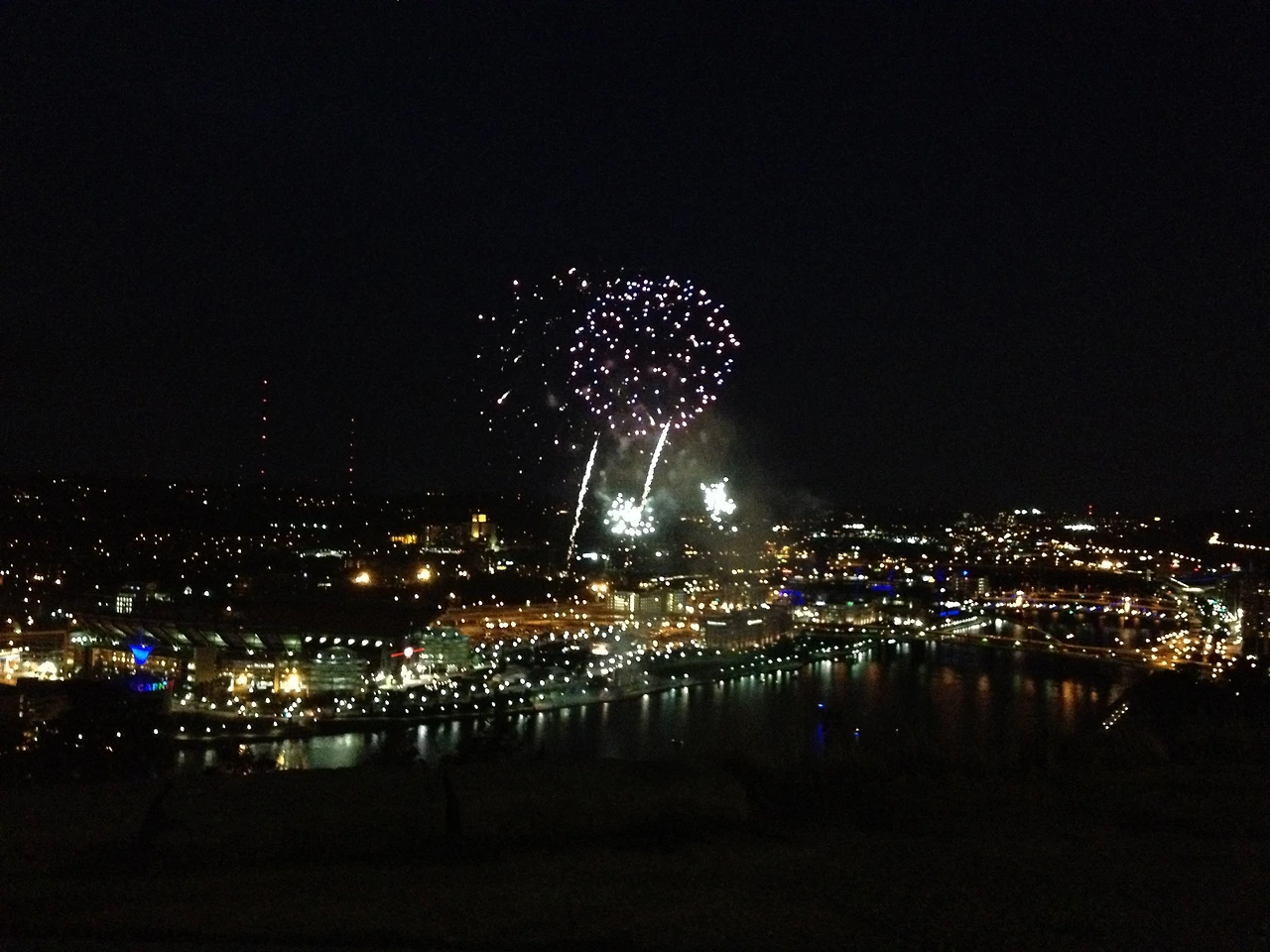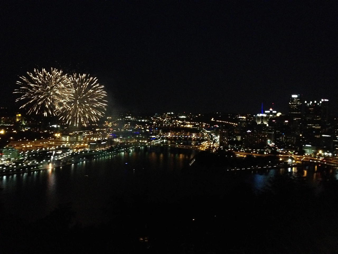 피츠버그는 세 강 - 엘리게니(Allegheny), 모논가힐러(Monongahela), 오하이오(Ohio) - 이 합류하는 지점이어서 산 위에서 내려다본 풍경은 물에 둘러싸여 있었다. 저 멀리 크리스마스트리처럼 점점이 불빛이 반짝였다. 고층 전망대에서 보는 질서정연한 도시의 야경(예컨대 시카고 같은)과 달리, 구불구불한 길들은 느긋하고 낭만적인 느낌이었다. 이 날은 마침 불꽃놀이를 하고 있어서, 하늘에도 크리스마스트리 같은 불빛들이 반짝였다.