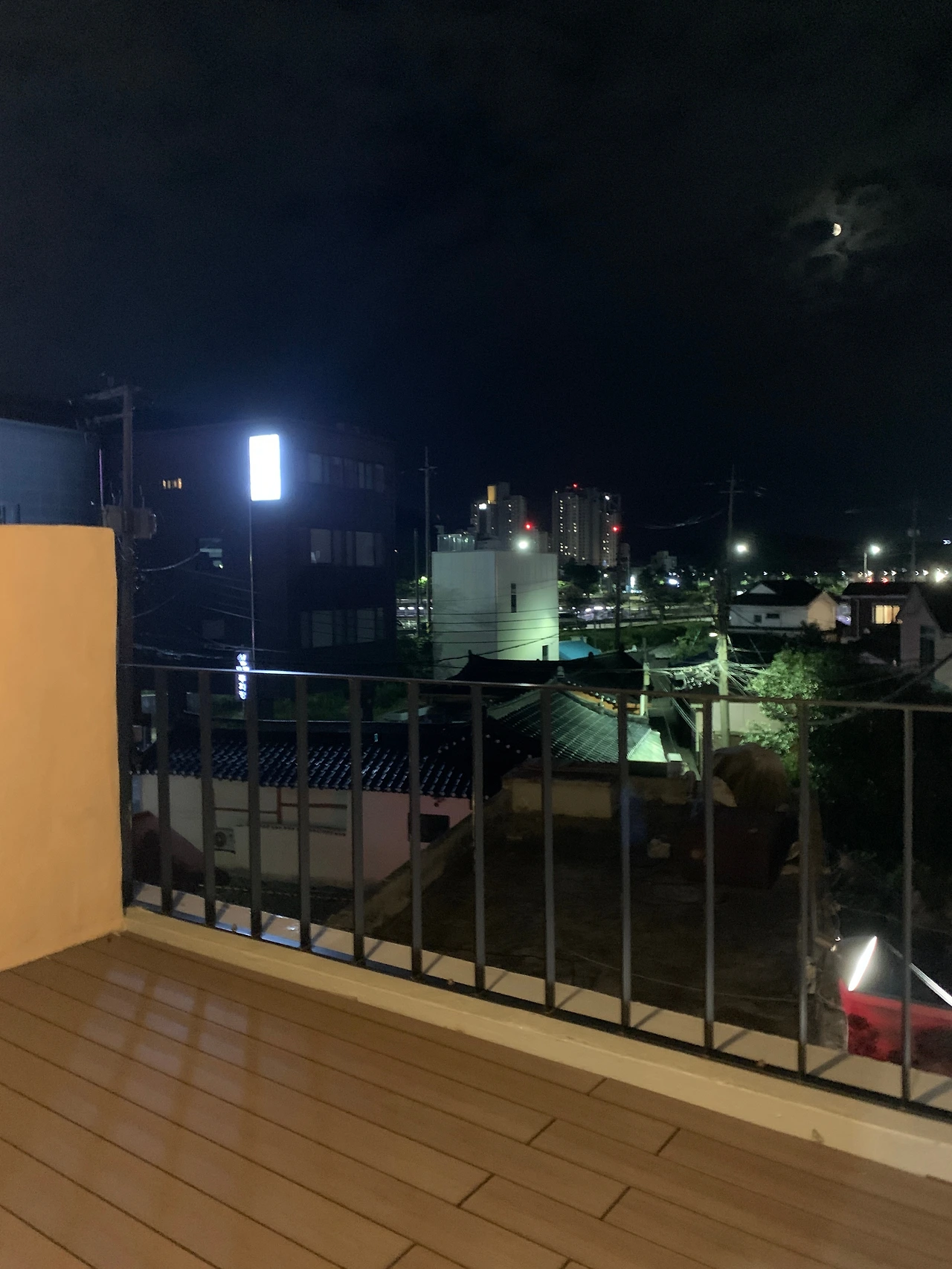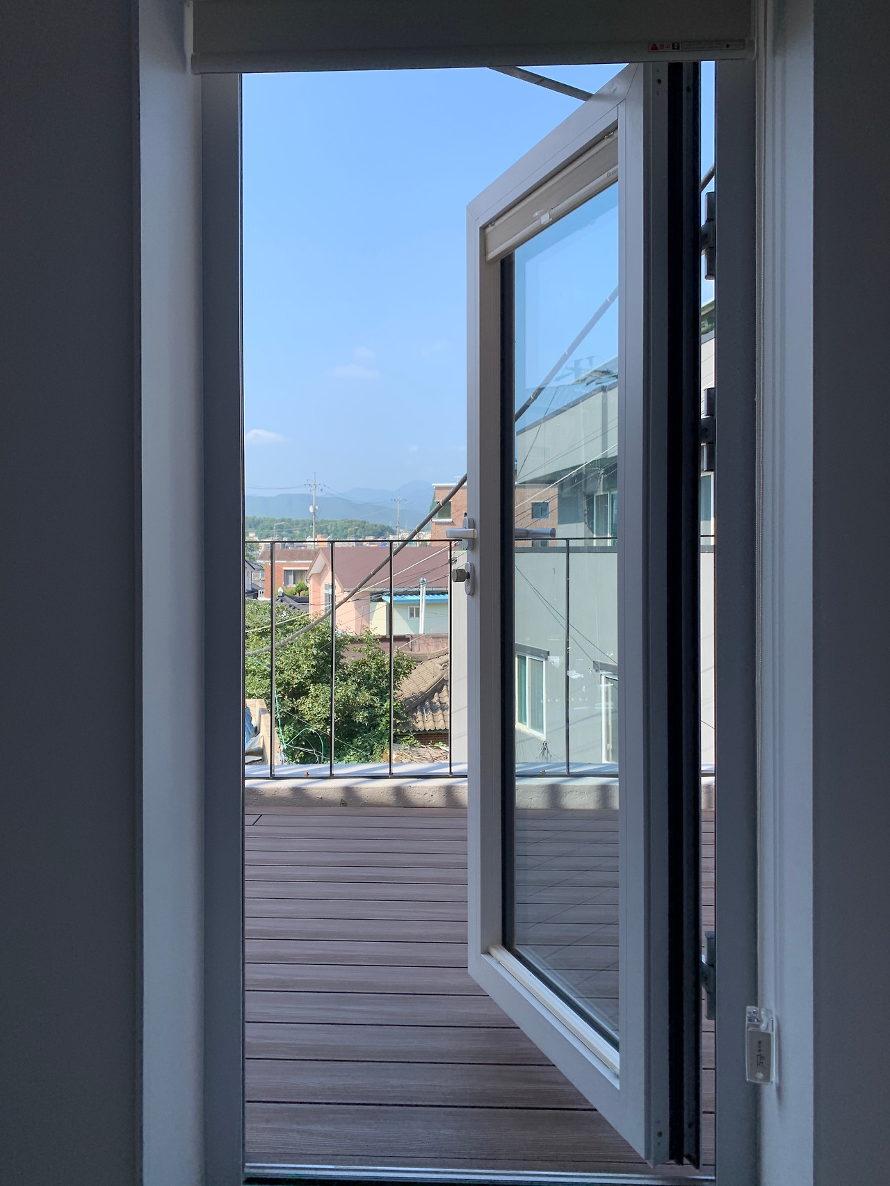 게다가 방 크기가 아주 작은데 침대가 높아서 편안한 느낌이 아니었다. 침대 높이만 낮았어도 괜찮았을 텐데… 그래도 예약할 때 방에 테라스로 나가는 문이 있는 걸 보고 이 문이 방 크기를 상쇄해주지 않을까 싶었고 이건 어느 정도 예상대로였다. 블라인드를 올리고 문을 열어놓으니 방이 조금은 넓어 보였다. 테라스에서 내려다보이는 소박한 동네 풍경도괜찮았다.