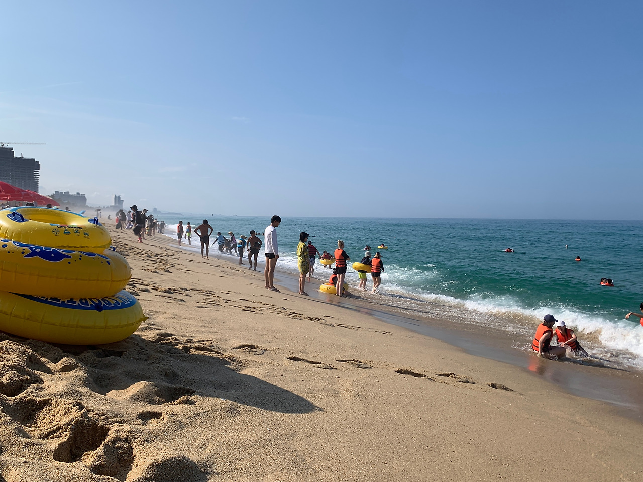 가까이서 보면 꽤 세게 밀려오는 파도가 멀리서 보니 잔잔해보인다. 거리를 두고 앉으니 사람들이 즐겁게 떠드는 소리도 아련한 배경음악처럼 들린다. 햇살은 더할 나위 없이 밝았지만, 미세먼지인지 안개인지 땅과 바다가 만나는 경계선에는 윤곽이 희미하게 흐려졌다. 바다를 보고 섰을 때 왼쪽 아득히 먼 곳에 보이는 높은 건물이 경포 해수욕장의 호텔이라는걸 경포에 다녀오고나서 알았다. 걸어 갈 수 있는 거리는 아닌데 시야를 가리는 것이 없어서 보이는 것이었다. 이 모든 풍경에는 확실히 마음을 가라앉히는 효과가 있었다. 파도가 쉴 새 없이 밀려와도 육지는 견고하구나, 하는 생각이 들었다. 그렇다면 밀려오게 내버려 두자.