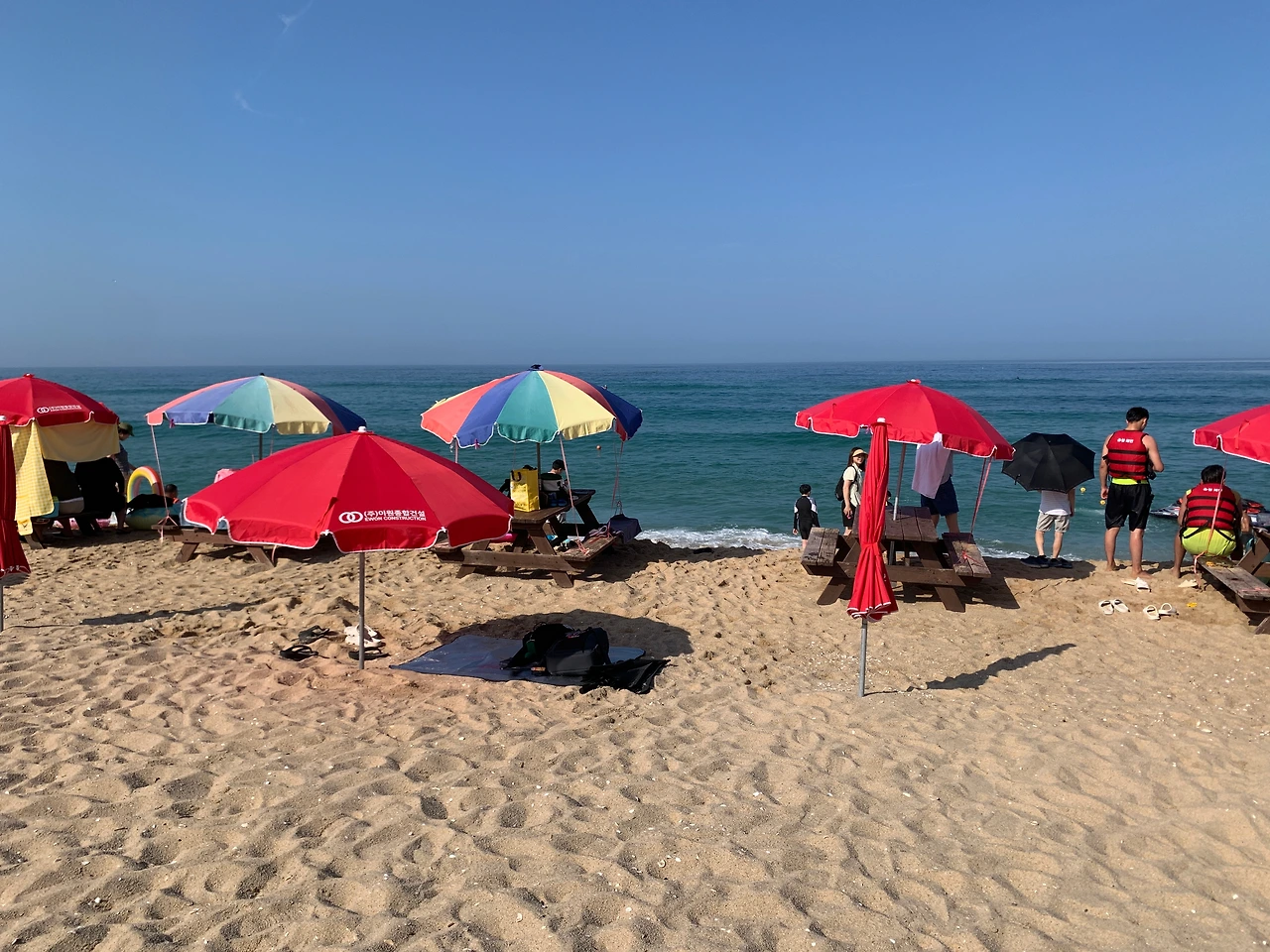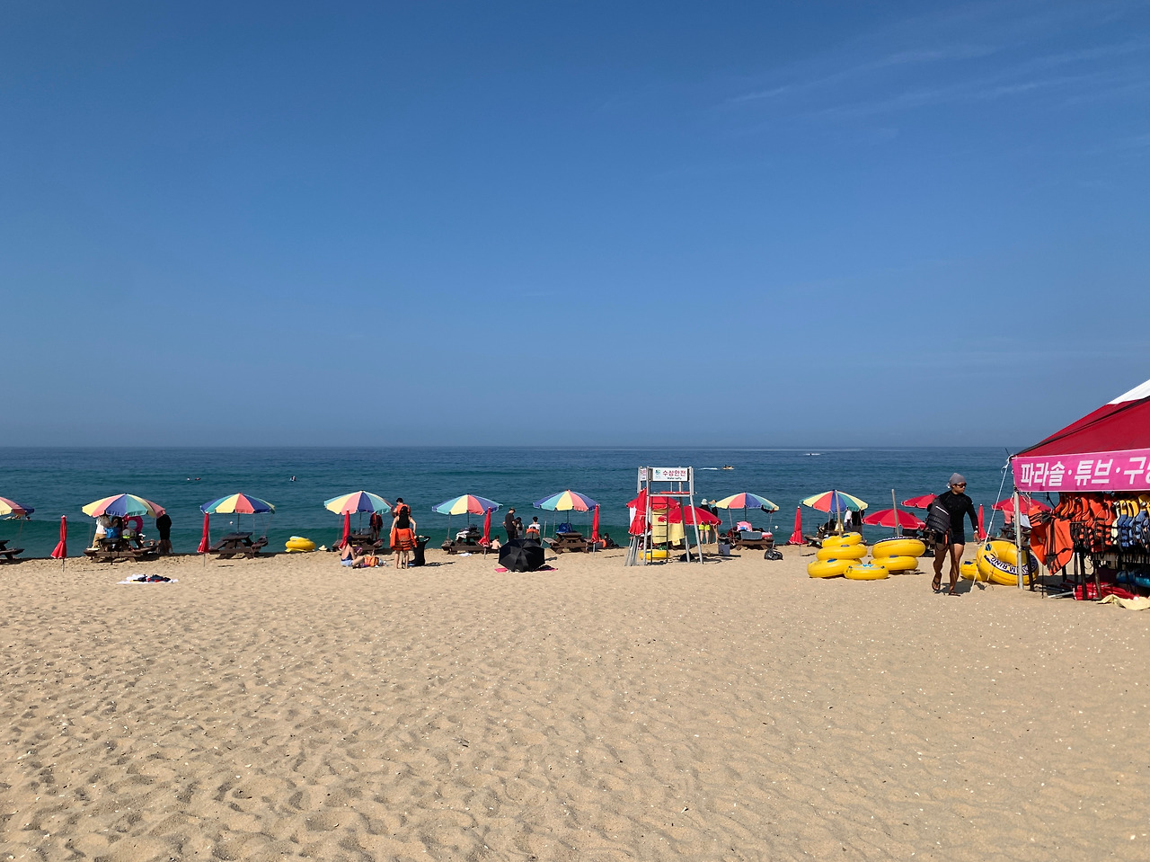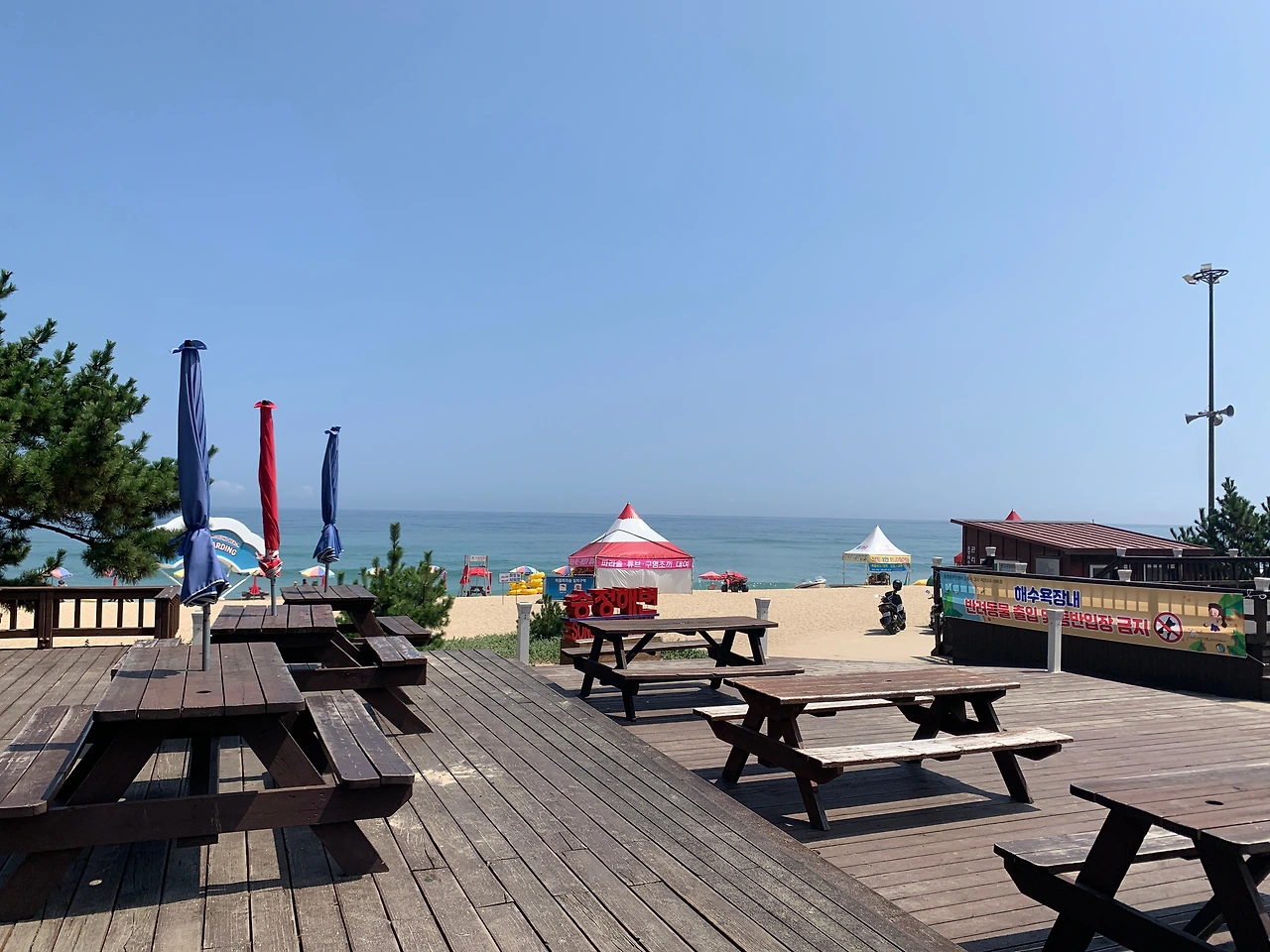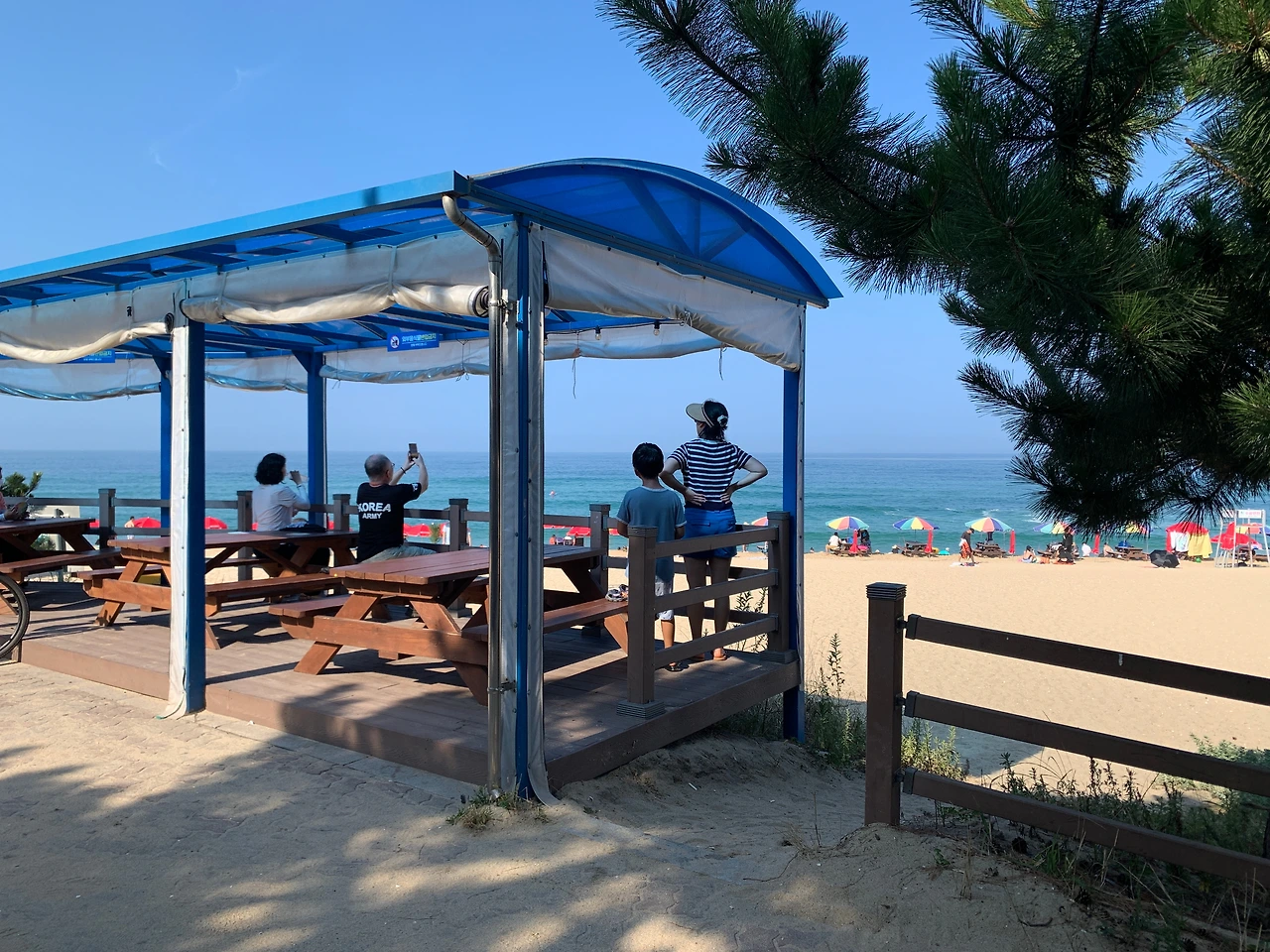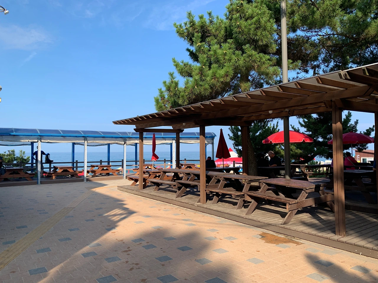 경포해수욕장 주변처럼 먹을 것이 즐비하지 않고, 매점이 딱 하나 있었다. 그 주변으로는 테이블과 벤치들이 놓여 있었는데, 여기 앉아서 오전부터 맥주를 마시는 동네 어르신들이 보였다. 두 번째 갔을 땐 간이무대에서 오카리나(?)를 부는 사람도 있었다.