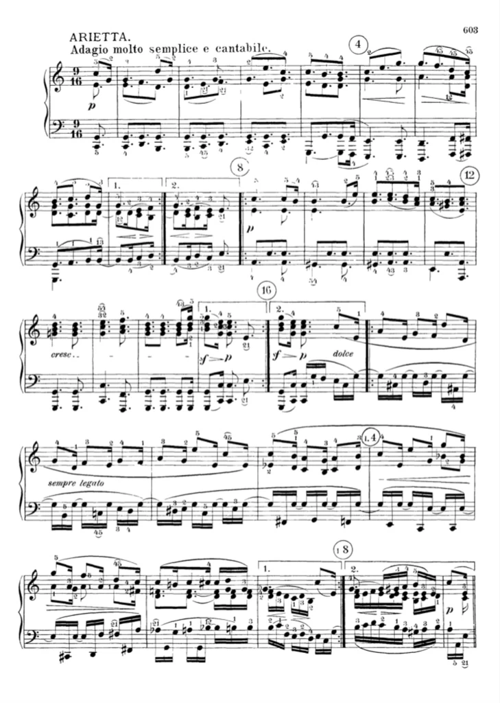 단순함과 복잡함이 아이러니하게도 한꺼번에 들어있는 이 소나타의 특이함은 조성에서도 드러난다. 이 곡의 2 악장은 검은 건반을 칠 필요가 없는 다장조이다. 가장 기본적인 조성인 것이다. 또한 으뜸화음은 으뜸화음으로 곡의 중심을 차지하며, 후반부에 가서는 더 그렇다. 불협화음을 해소하지 않은 채 종지를 지연시킨다던가 음정을 급격하게 확대한다던가 식의, 요컨대 낭만주의 음악이 갔던 길을 가는 것도 아니라는 것이다. 그런데도 결과적으로 나오는 효과는 고전주의 음악의 전형과는 너무 다르다. 그래서 아도르노는 흔히 이야기하듯이 베토벤이 낭만주의의 선구자였던 것이 아니라 낭만주의를 뛰어넘었다고 말한다. 이 곡을 “인류의 불가사의”라고 표현했던 안드라스 쉬프의 말에 너무나 동의한다. 어떻게 이렇게 가장 기본적인 틀 안에서 가장 극단적인 창의성이 발휘될 수 있을까? 이 곡을 듣고 있으려면 어느 순간 정신이 조금 혼미해지면서 현기증이 나는 것을 경험할 수 있다. 베토벤은 20세기의 많은 락 음악가들이 추구했던 ‘다른 세계를 보는 지각의 문’을 한 세기 앞서 열었던 것인지도 모른다.