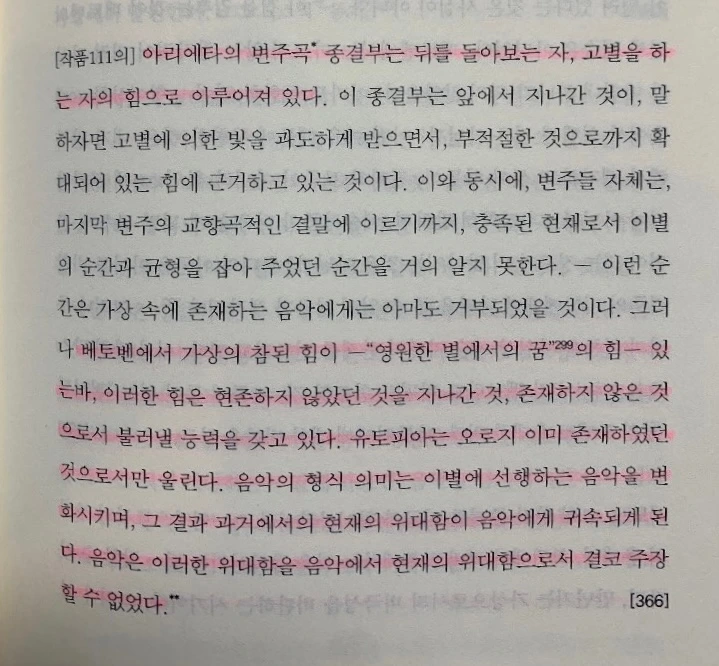 이 후기 작품들을 이해하는 데 아도르노의 글들이 많은 도움이 되었다. 아도르노가 ‘만년 양식’이라고 부른 이 최후의 소나타들은 뜻밖에 한없이 가볍고 누군가의 표현처럼 ‘허공을 떠도는 듯한’ 느낌이 든다. 하지만 이것은 모차르트처럼 천진난만한 가벼움이 아니라 전통적인 음악의 구조를 다 해체한 끝에 나오는 수수께끼 같은 가벼움이다. 역설적인 것은 중력을 초월한 것 같은 이 가벼움이 더할 나위 없이 복잡한 구조에 의해 구현된다는 것이다. 시각적으로 악보를 봐도 인간의 힘으로(?) 연주가 가능한가 싶을 정도로 난해하다.
