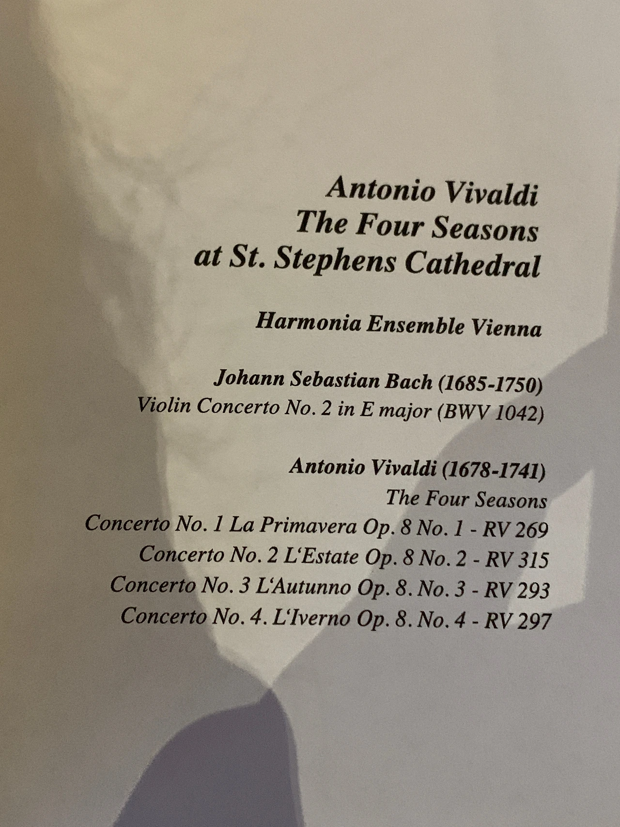 재밌는 건 레퍼토리가 비발디의 <사계>였다는 것. 또 이탈리아다! 기왕이면 오스트리아 음악가의 곡을 들었으면 했지만(비발디 이전에 바흐의 바이올린 콘체르토도 한 곡 연주했다), 연주 자체는 생각보다 무척 좋았고, 성당의 넓은 공간에 소리가 잘 울려 퍼졌다. 비록 두 번째로 저렴한 표라서 연주자들 모습이 잘 안보였지만 ㅎㅎ