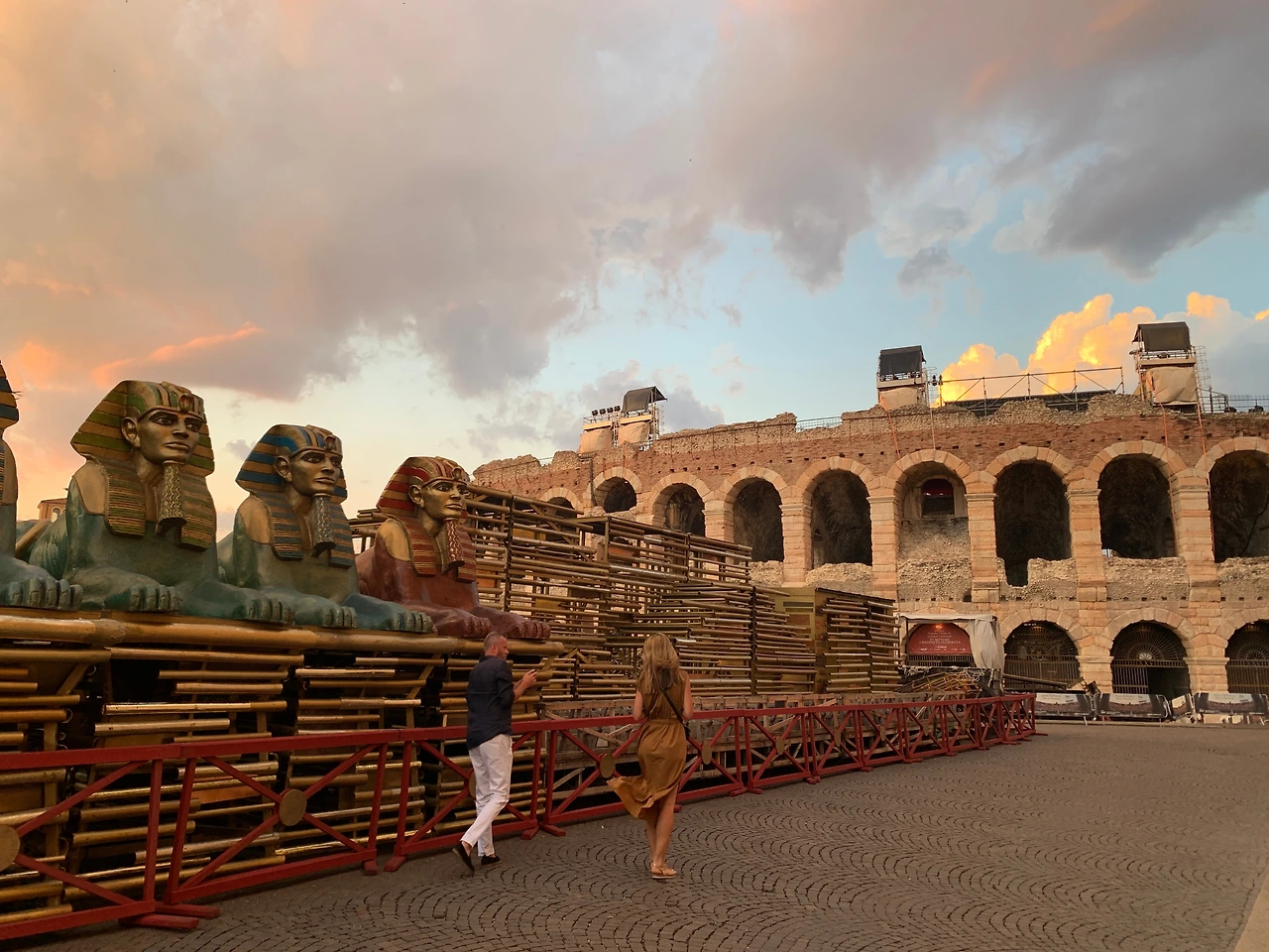 아레나 주변에 놓여 있던 커다란 조각상들도 재미있는 구경거리였다. 이 이집트풍 조각상들은 아마도 <아이다>의 무대장치겠지? 저 큰 것들을 어떻게 안으로 옮기는지 궁금했다.
