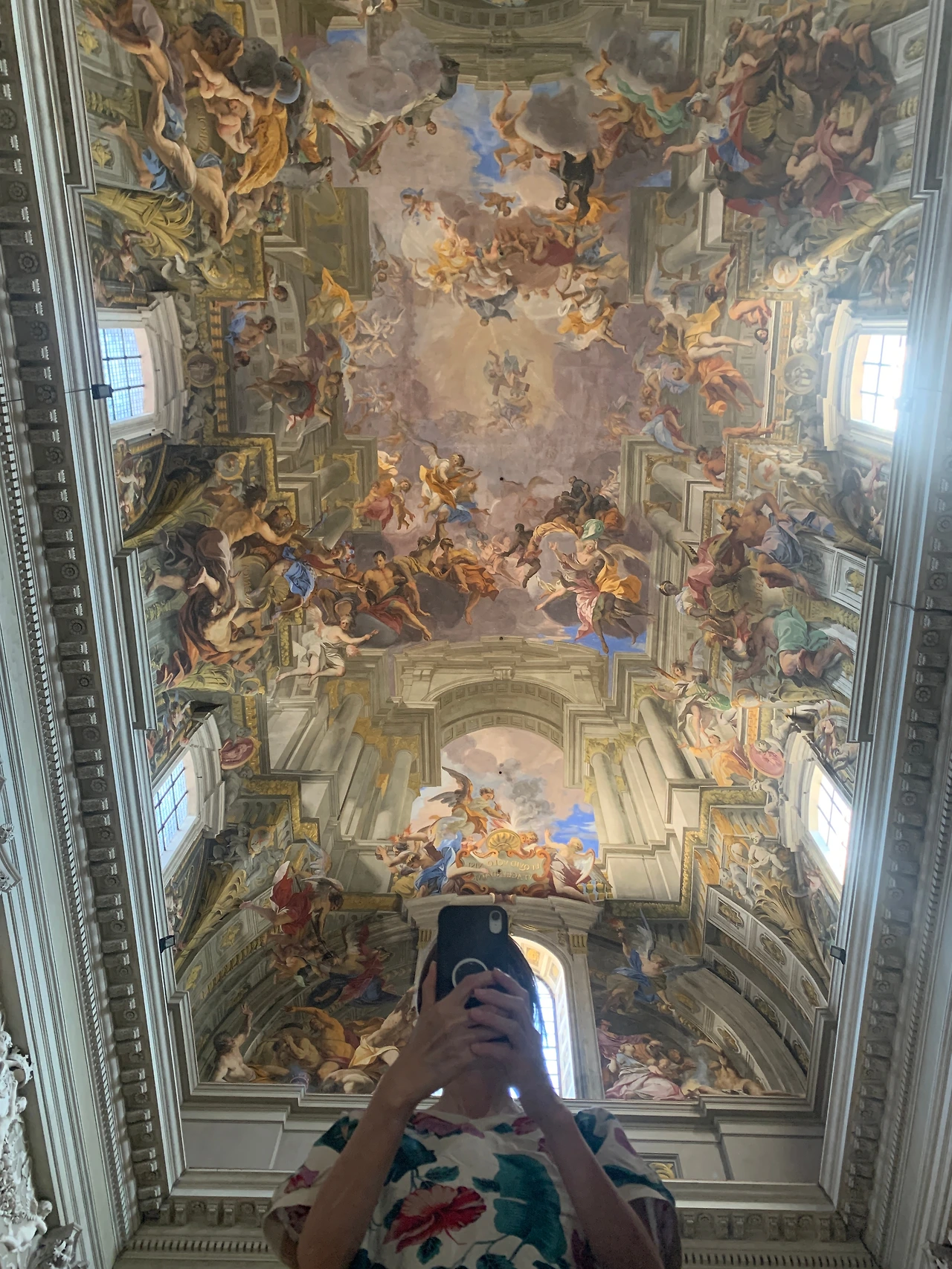 이 성당은 반종교개혁의 선봉에 섰던 예수회에서 설립한 곳으로, 포초의 천정화는 프로테스탄트의 반이미지주의와 대립되는 화려한 원근법적 환각의 극치를 보여준다. 건축물의 일부인 평면 공간이 트롱페이유 기법으로 그려진 그림 때문에 삼차원의 입체보였다. 지금의 시각으로 봐도 어디까지가 그림이고 어디까지가 아닌지 살짝 구별하기 힘들 정도였다.