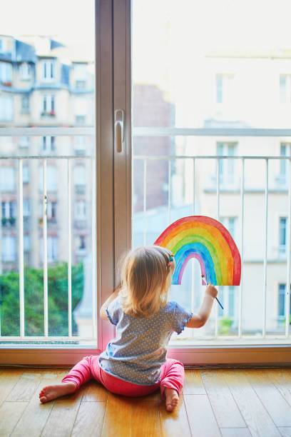 간절한 색으로 칠한 무지개를 창문에 그려놓는다
