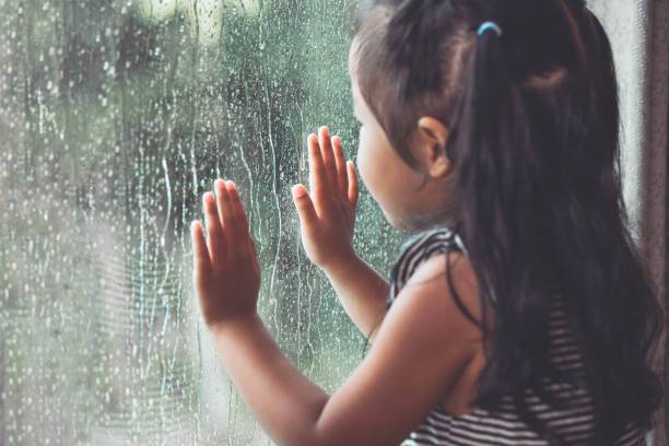 창문에 주르륵 내린 비 바라보며