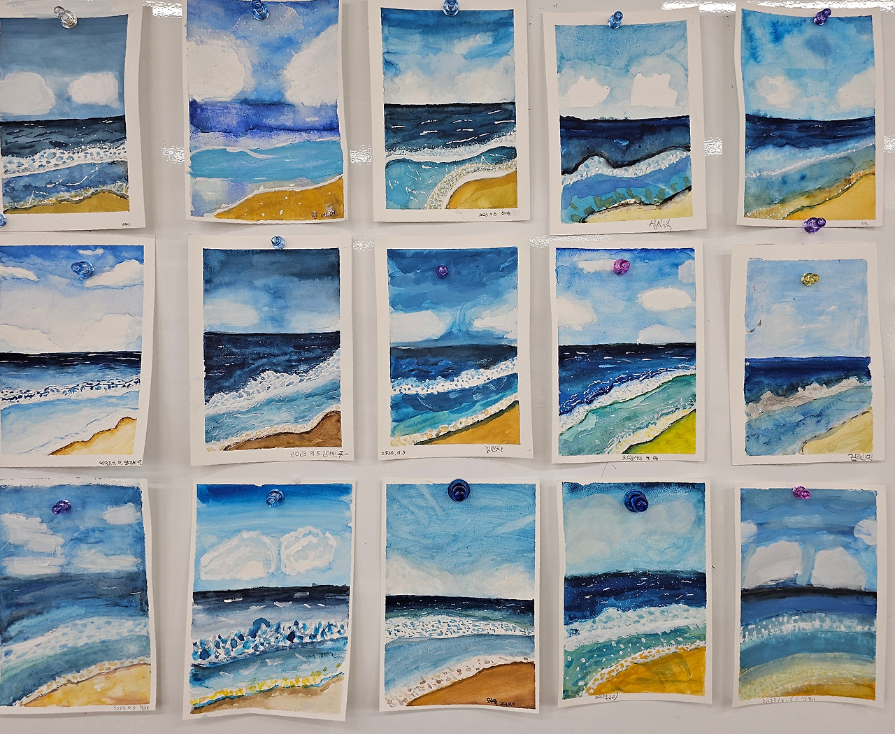 "선생님 너무 어려워요!!"가 속출했지만 기어코 이렇게 완성해 왔다. 저 하얀 물거품이 이는 파도 그리기가 보통 어려운 게 아니고 하늘의 구름을 표현하는 것도 정말 쉽지 않은데 아이들 고유의 성격이 보인다. 솔직히 중간 즈음에는 '이거 큰일이다. 그만둘 수도 없고.'라고 생각했는데, 완성된 작품들은 괜찮다. 어쩌면 내 눈에만 괜찮을 수도... 나는 도치 선생님이니까.