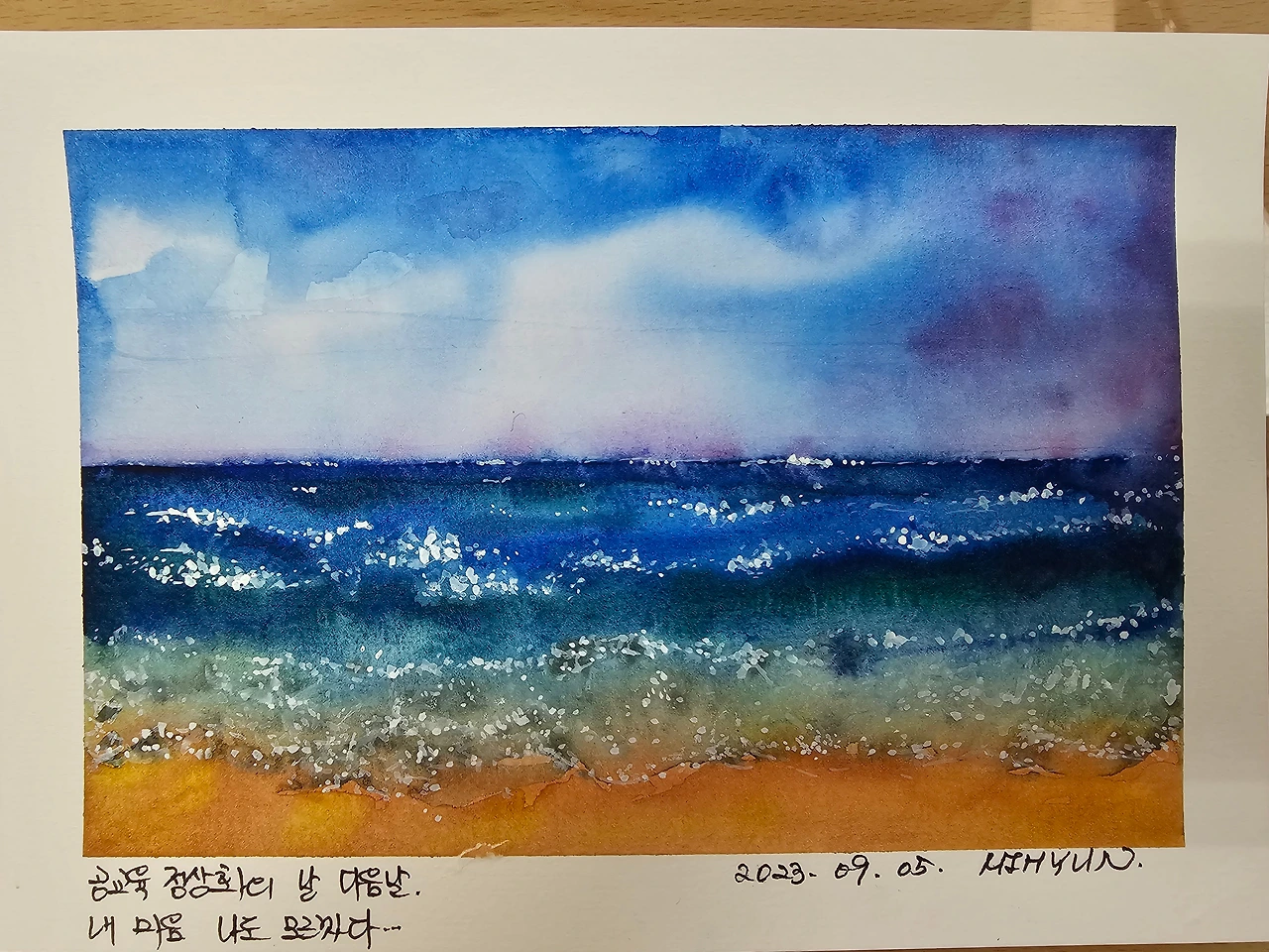 여섯 장의 바다 풍경을 그렸는데 그릴 때마다 계속 달라졌다. 비슷한 풍경인데 다 느낌이 달랐다. 그리고 계속 그리다 보니 내가 표현하고 싶은 풍경이 어떤 느낌인지도 알게 되었다. 나는 이렇게 자연스럽게 녹아내리는 풍경을 좋아한다. 여전히 물감은 나에게 어렵고 마음대로 표현은 안 된다. 그래서 수채화 입문 3년째에 접어드는 지금도 종이를 꺼내고 팔레트를 펼치는 과정은 한 번 심호흡을 필요로 한다. 그래도 일단 물을 종이에 깔고 물감을 올리고 손을 움직인다. 과감하게 혹은 세심하게. 자연스러운 번짐으로 느껴지도록 경계선을 풀어주고 다른 색을 올려서 녹아들게 한다. 아직도 서투르지만 그래도 이제 그림을 그릴 수 있어서 즐겁다.