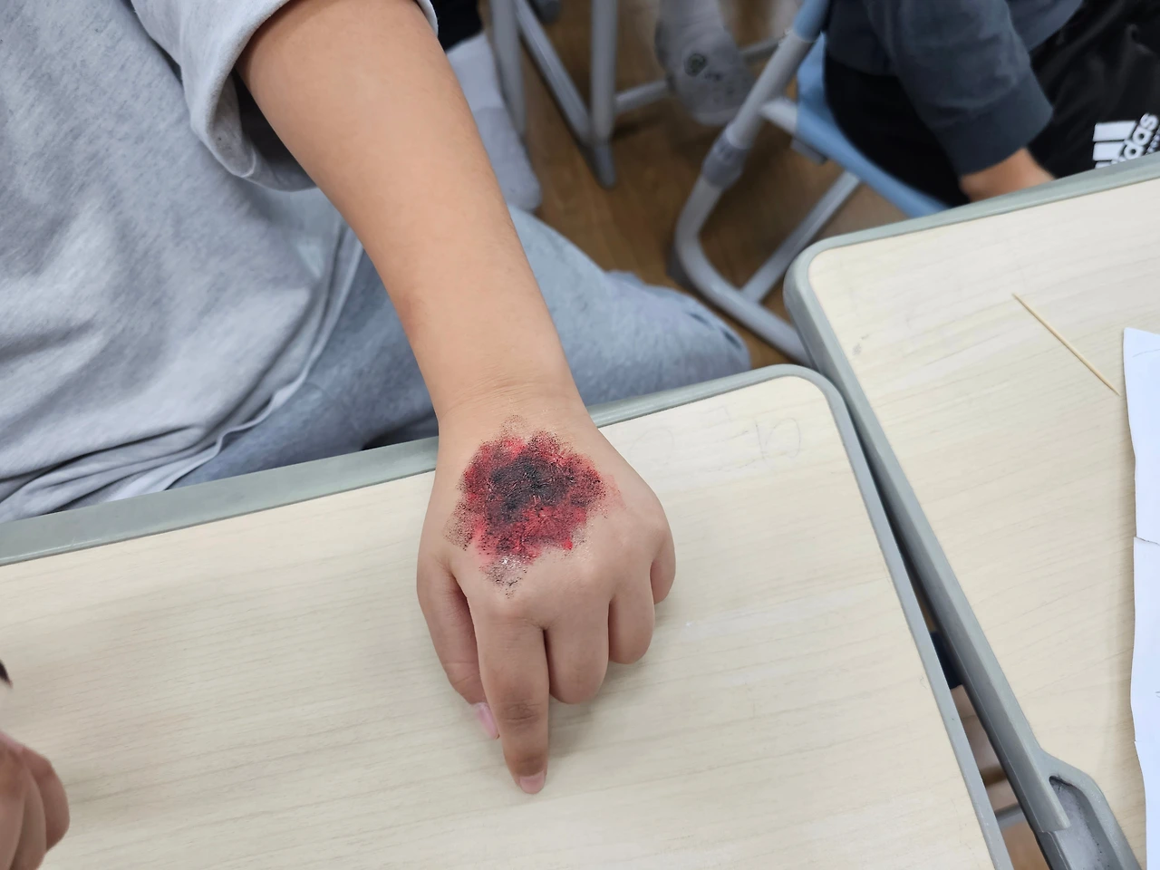 드디어 현직 특수분장 전문가 선생님이 오셨다. 강의를 들으면서 특수분장사라는 직업에 대해서 새로이 알게 된 것도 많고 어떤 직업이나 그렇겠지만 정말 쉽지 않은 일이라는 것도 확인했다. 교사라는 직업 세계만 경험한 나에게는 좀 더 시선을 확장할 수 있는 좋은 시간이었다. 드디어 아이들이 기다리던 특수분장 시간. 화상을 입은 것처럼 보이기 위해서 라텍스 액을 바르고 이쑤시개로 살짝 뜯어서 구멍을 만든 다음, 색 물감과 색 물엿을 적절하게 바르면 화상자국이 완성된다. 아이들은 즐거워했고 보는 나도 즐거웠다. 사진을 찍고 싶다길래 그러라고 했다. 몇몇 아이들이 부모님께 사진을 보낸 모양이다. 깜짝 놀라길 바랐는데 "어마나, 놀라워라. 뭐니." 같은 반응에 아이들은 아쉬웠던 모양이었다.