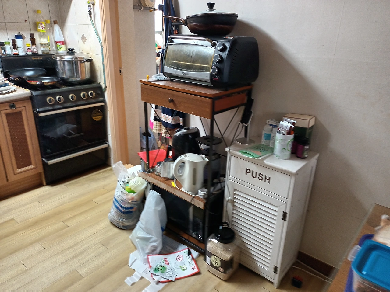 오전 내내 쓸고 닦고 정리하고 버렸더니 저 공간이 저렇게 나왔다. 저 광경이 애프터라고 경악하시는 분들이 계시다면... 원래는 오븐거치대를 성벽이 둘러싸고 있었다. 내벽과 외벽 두 겹으로. 되어있었다.. 치우니 좋았는데 유지가 문제다.