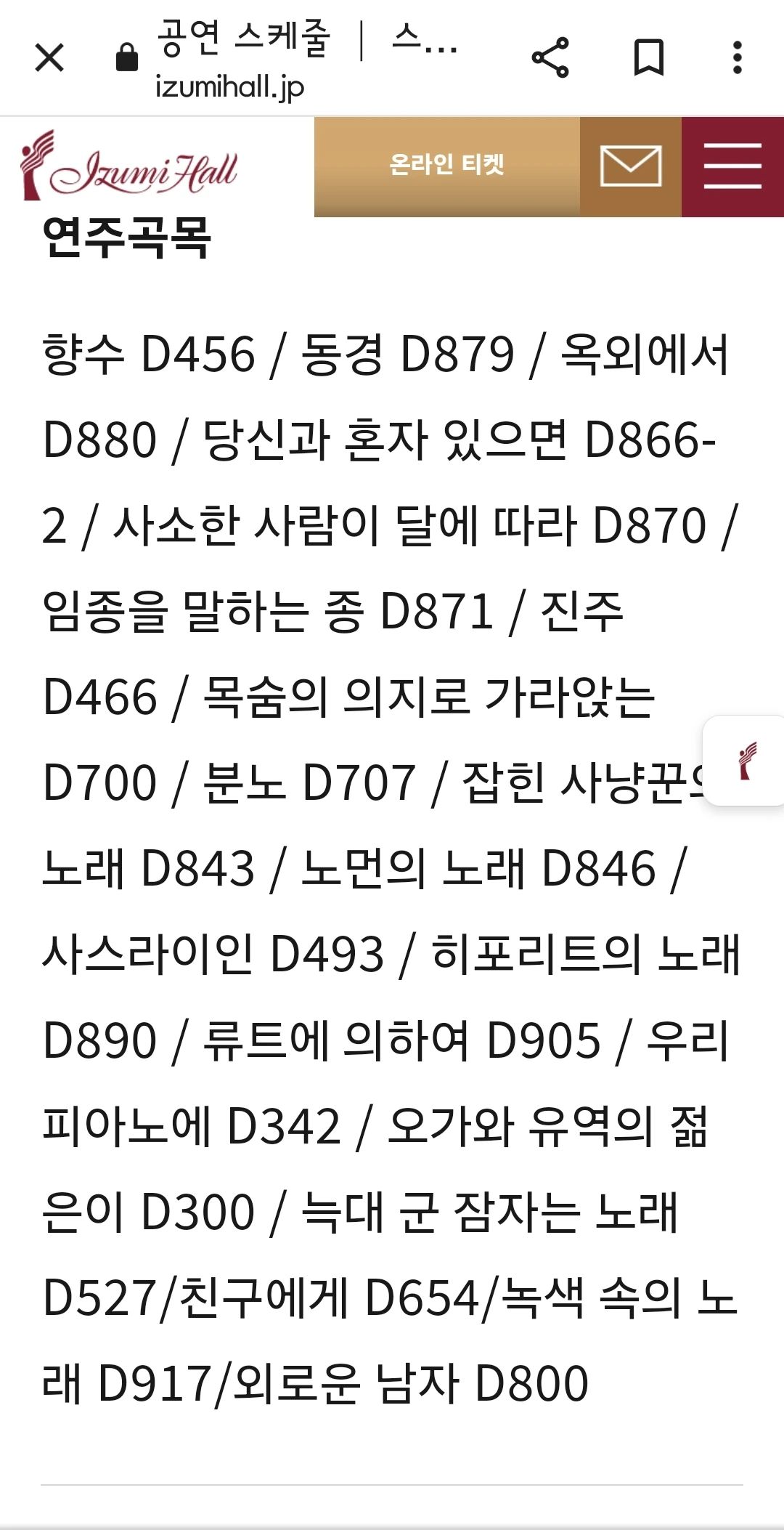 혼자서 발끈하다가 문득 클래식 공연 생각이 났다. 분명 오사카에도 클래식 콘서트 홀이 있겠지. 그러나 네이버에 아무리 검색해 보아도 오사카 여행에서 클래식 공연을 보았다는 사람은 없고 공연장에 대한 이야기를 쓴 사람도 없었다. 장소 자체가 나오지 않아서 이번에 구글에 osaka concert hall이라고 검색해 보았다. 나온다! 꽤 많이 있었다. 차례차례 들어가서 공연 일정을 확인해 보았다. 아니... 이 큰 홀들에 대관이 없는 날짜가 이렇게 많다고? 우리나라로 치면 예술의 전당이나 세종문화회관, LG 아트센터 같은 곳들인데 하루라도 공연이 없는 날을 본 적이 별로 없는 것 같다. 크고 작은 홀들에서 상시 공연이 열리는데 드문드문 공연 일정이 보일 뿐이었다. 점점 슬퍼지기 시작했다. 그러다 겨우 두 개를 찾았다. 하나는 일본 작곡가의 창작곡 와 브루크너 교향곡 7번을 연주하는 오케스트라 연주와 또 다른 하나는 테너 이안 보스트리지와 피아니스트 줄리어스 드레이크의 슈베르트 가곡 독창회였다.